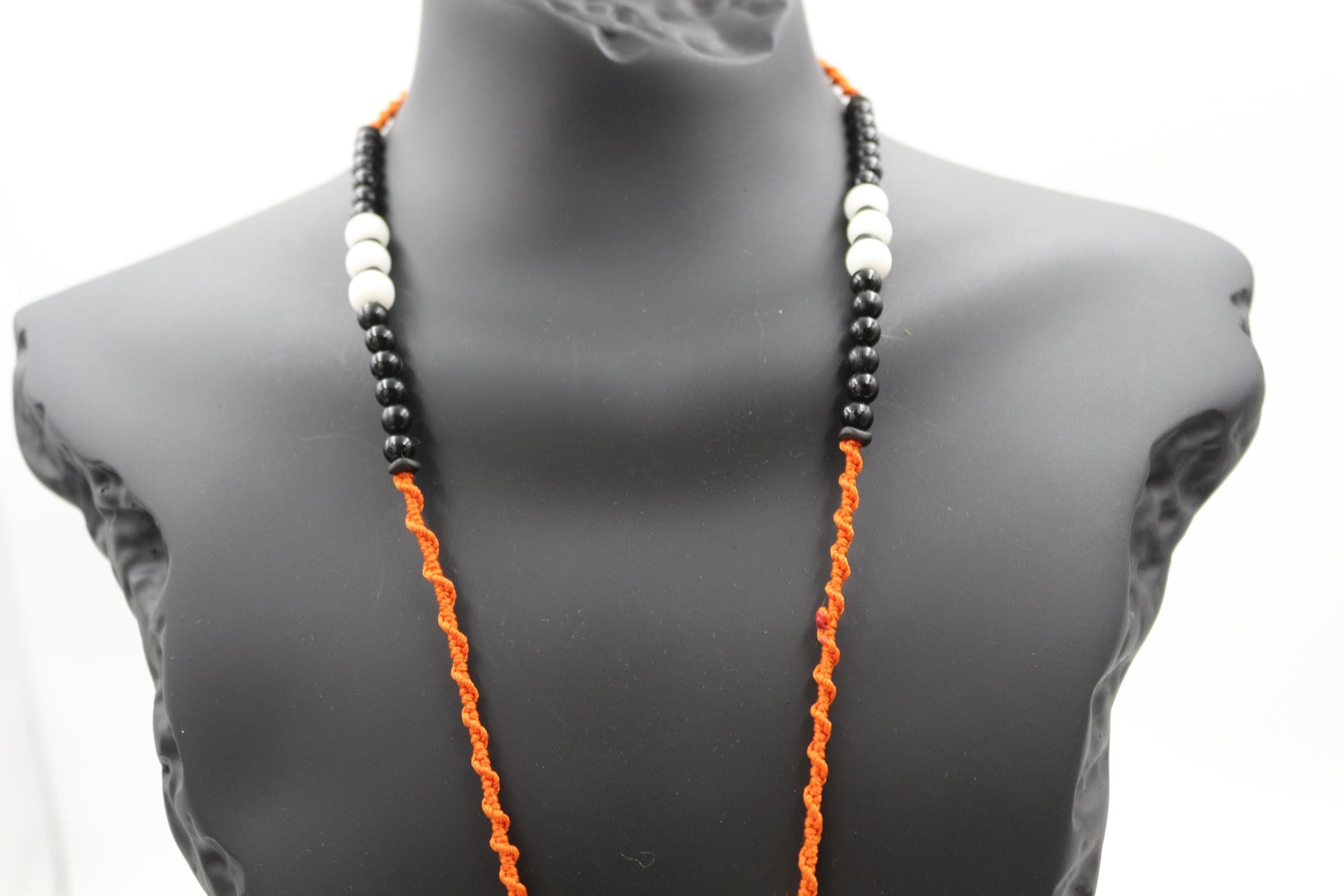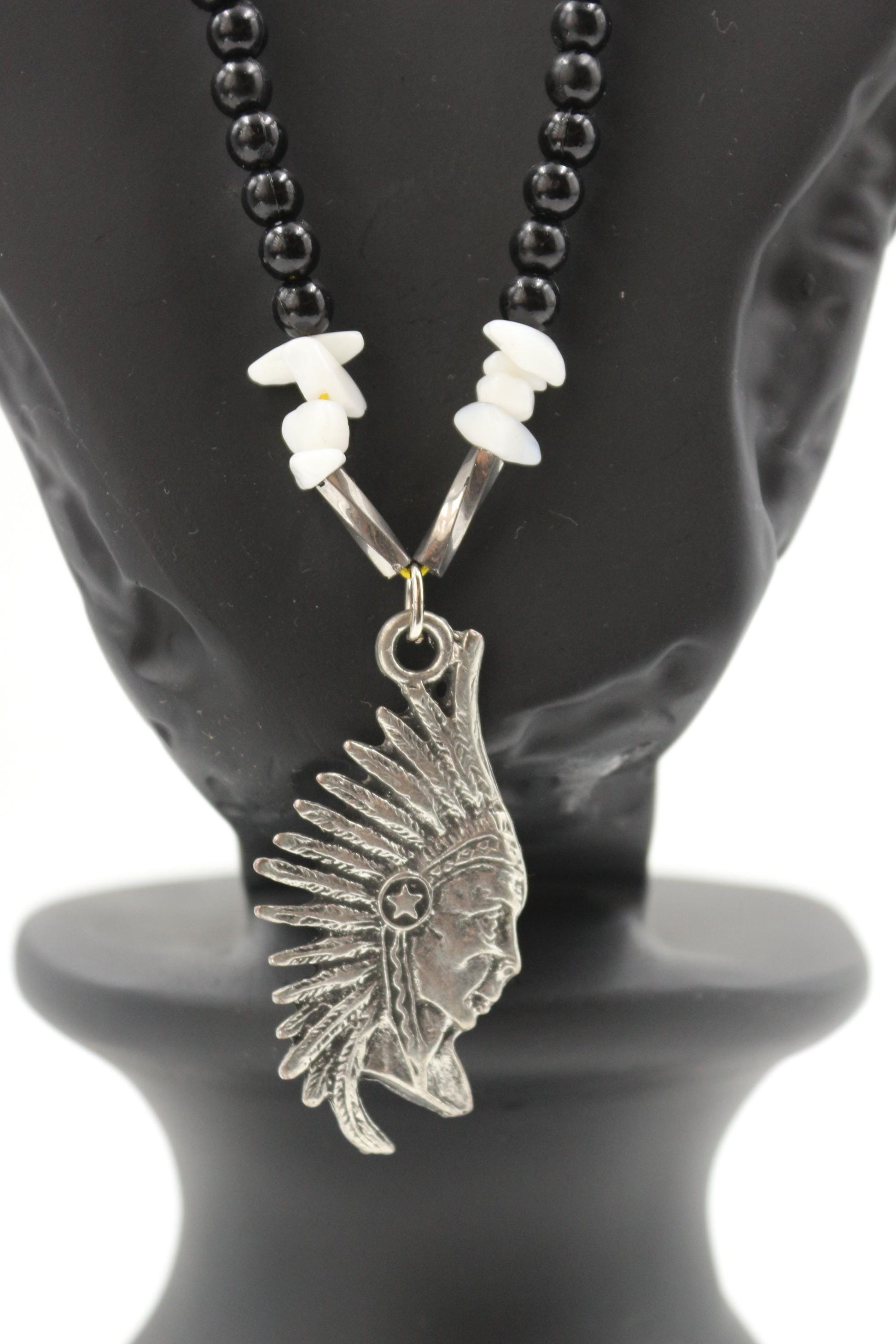Agate - Handmade Necklace with Unique Design "Chief" Necklace - Handmade with Ethnic Motifs This unique handmade necklace in an ethnic style combines powerful symbolism with natural stones and contrasting colors. The central element is a pendant in the form of a Native American chief's profile, complemented by a strand of black, orange, and white beads. Design and Features: "Chief" Pendant: The metal pendant is crafted in the form of a Native American chief's profile with a feathered headdress. The detailed design of the pendant creates an effect of authenticity and symbolizes strength, wisdom, and spirituality. Black Beads: Black beads form the main strand of the necklace. Their dark color creates contrast with the bright orange and white elements. Orange Thread: An orange thread, woven into a part of the necklace, adds brightness and expressiveness to the design. Its color symbolizes energy, passion, and vitality. White Agate: Small pieces of natural white agate are placed symmetrically along the necklace strand. White agate symbolizes purity, tranquility, harmony, and spirituality. Metal Inserts: Silver-tone metal inserts between the beads add a modern and stylish look to the necklace. Symmetrical Arrangement: The elements of the necklace are arranged symmetrically, giving it a harmonious and balanced appearance. Energy: "Chief" Pendant: Strength, wisdom, spirituality. Black beads: Protection, grounding. Orange color: Energy, passion, vitality. White agate: Purity, tranquility, harmony, spirituality. Care: It is recommended to avoid contact with water, perfumes, and other chemicals. Store in a dry place, preferably in a separate box or pouch. This necklace will be a bright accent to your look, adding a touch of ethnic exoticism and symbolism. It is suitable for both everyday wear and special occasions, especially for those who appreciate ethnic style and the symbolism of Native Americans.