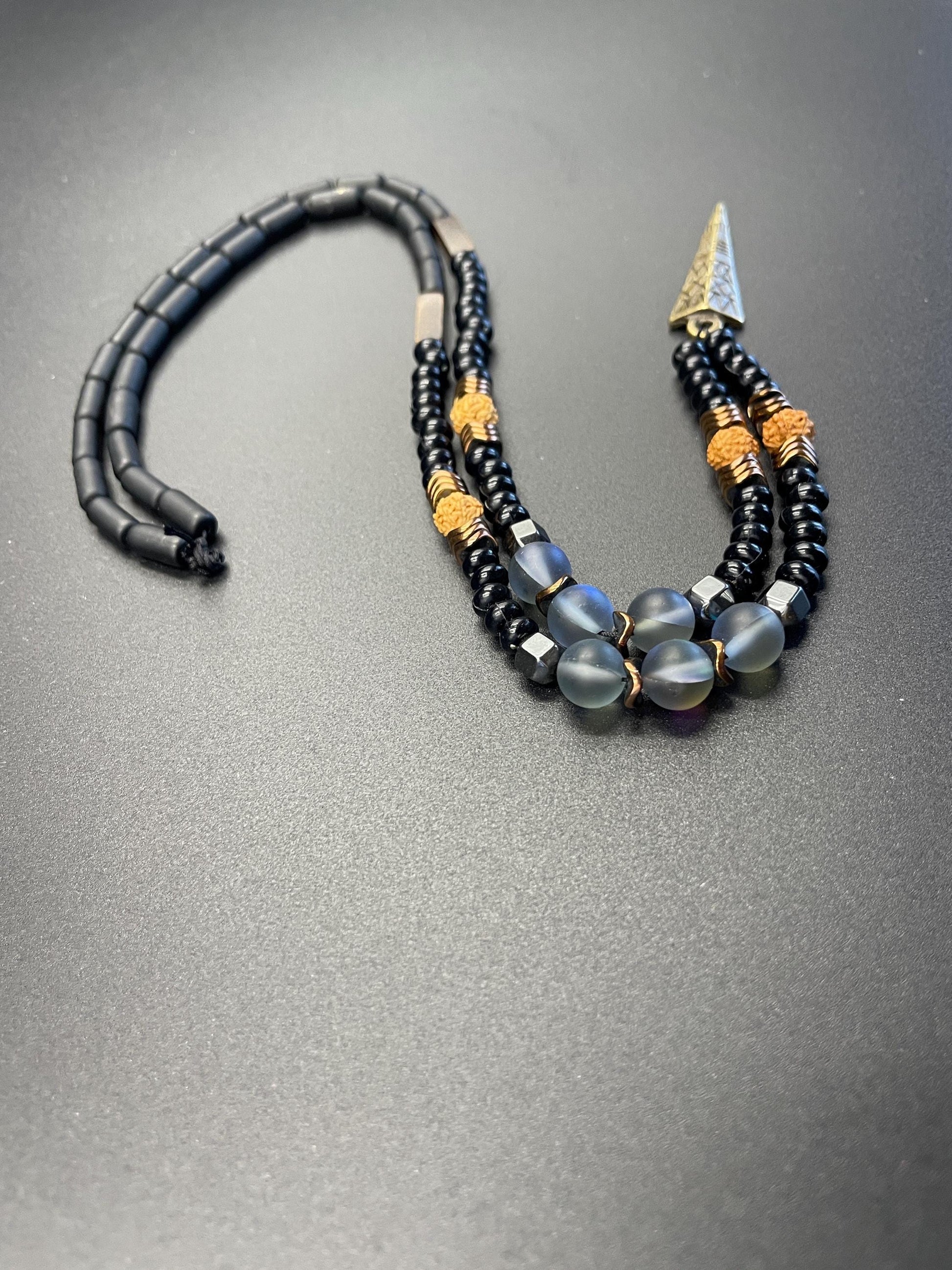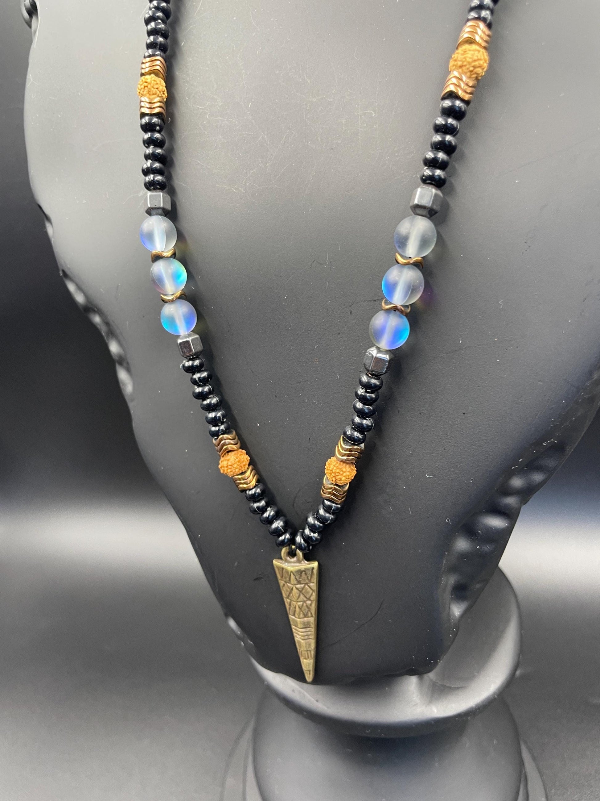 Antique Archer Necklace – Blue Thermal Gemstone • Tiger Eye • Hematite • Rudraksha Seed • Men’s Spiritual Amulet • Handmade Tribal Jewelry