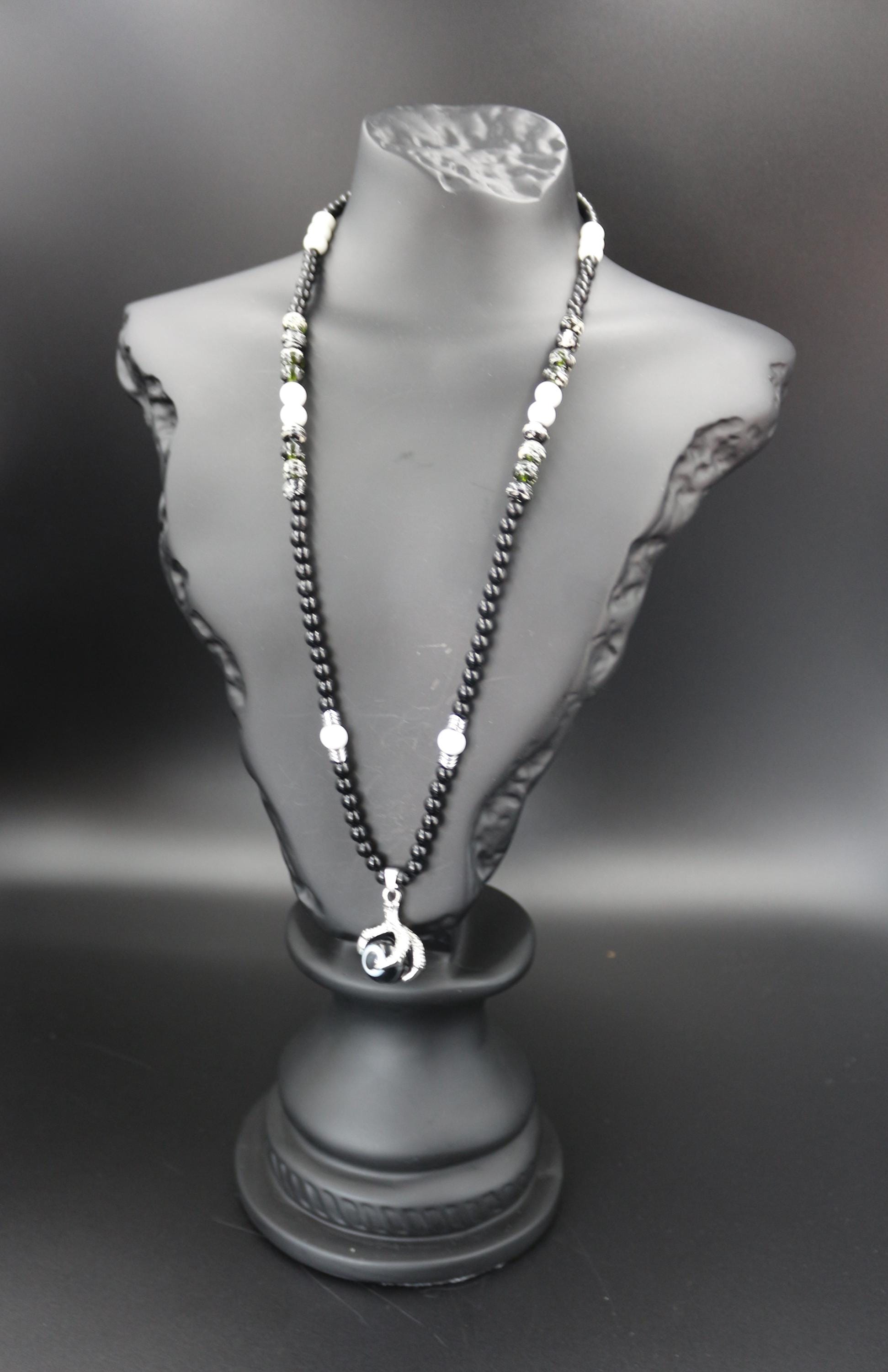 Beads: The necklace consists of a strand of black beads, which may be made of onyx or black agate.