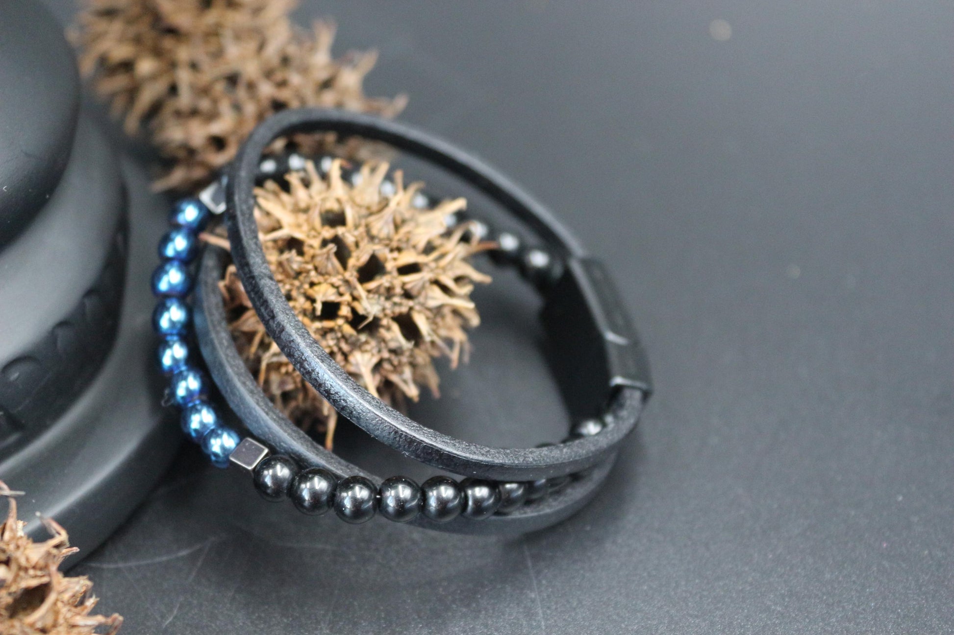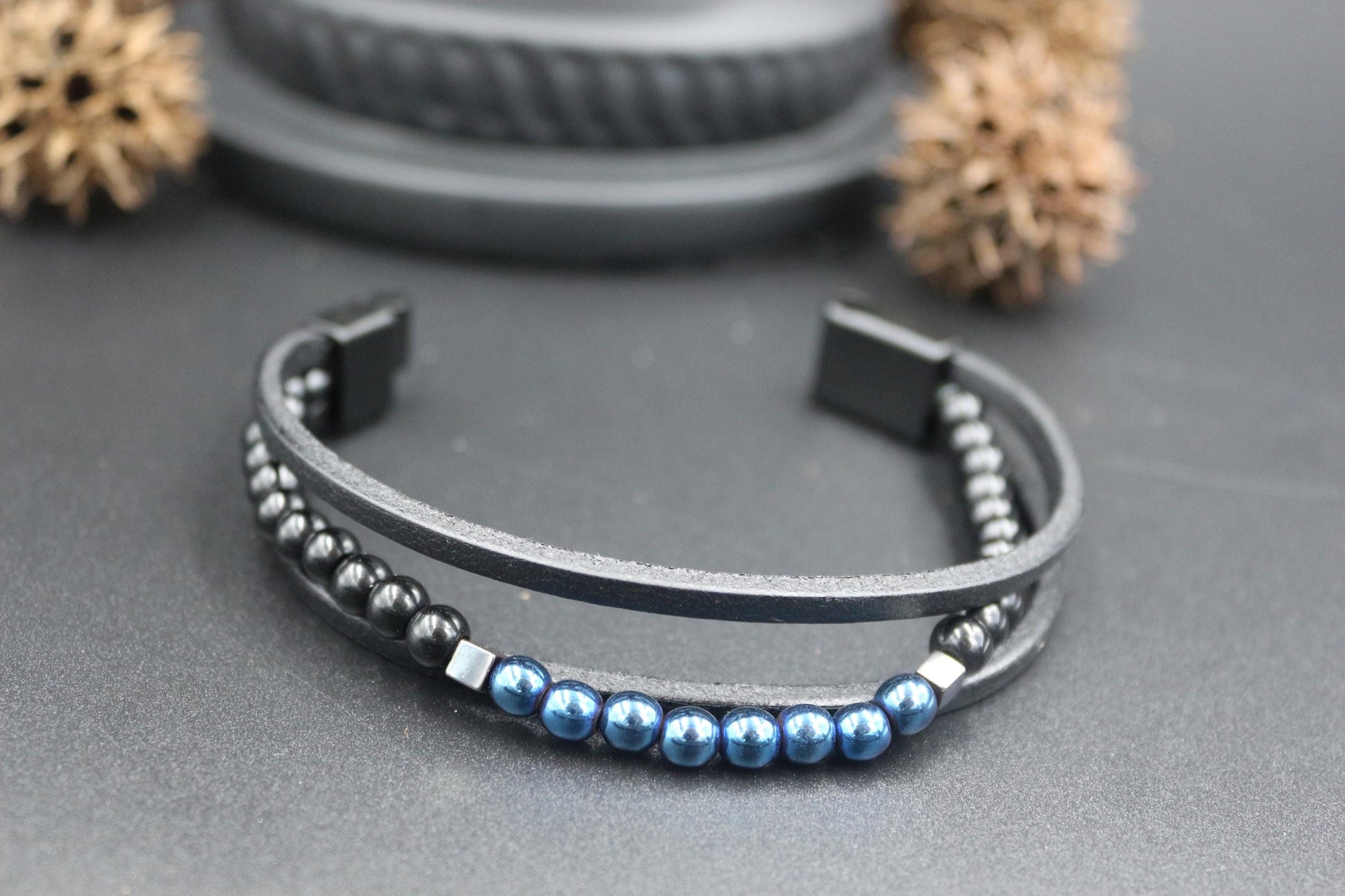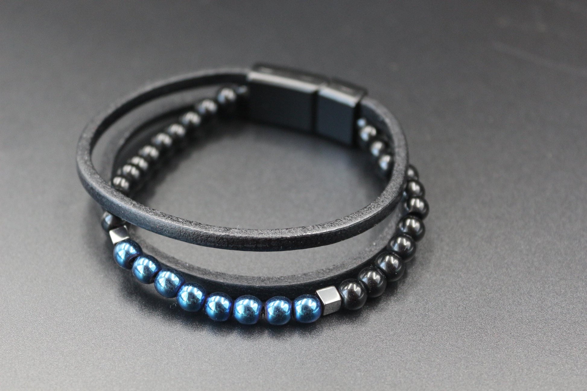 "Classic Strength" Bracelet - Genuine Leather, Blue Hematite, and Natural Stone