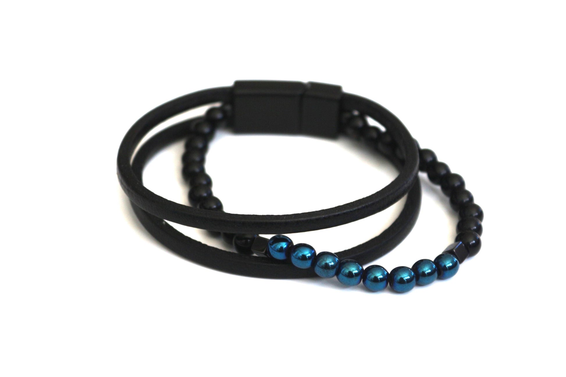 Bracelet - Genuine Leather, Blue Hematite, and Natural Stone