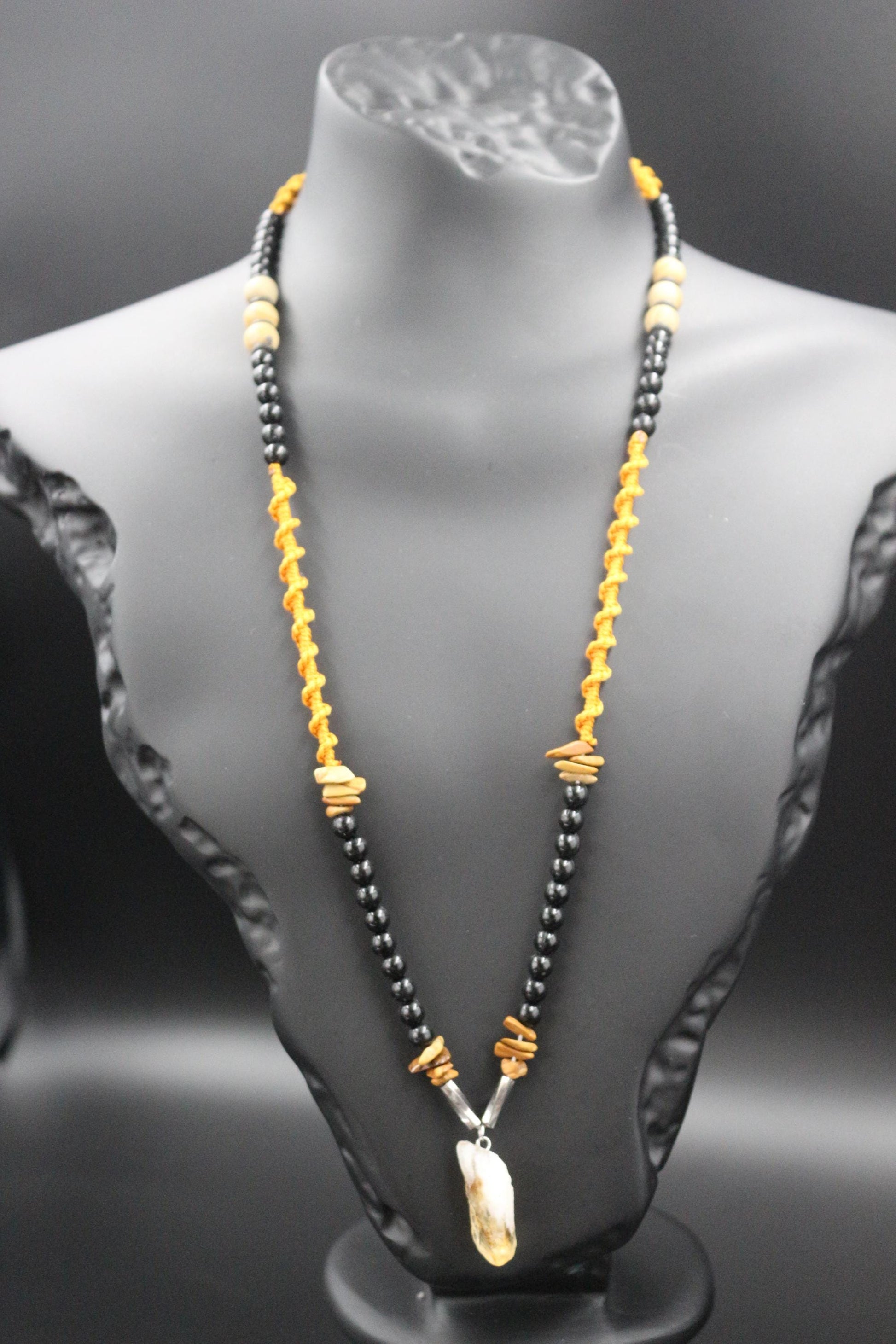 Hand Weaving: The orange woven cord, made by hand, is a bright accent of the necklace. The weaving adds texture and uniqueness, emphasizing the craftsmanship.
