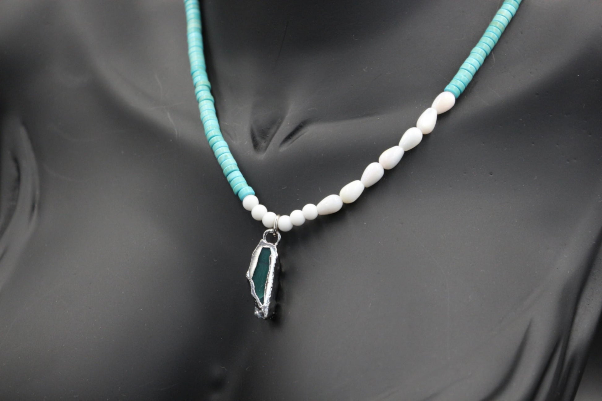 This exquisite necklace is a testament to the beauty of natural materials and ethnic design. The centerpiece is a teardrop-shaped pendant of natural turquoise, framed by a silver-tone setting. The necklace is further adorned with small turquoise beads and oval-shaped white beads, creating a harmonious and eye-catching composition. The clasp is both convenient and secure.