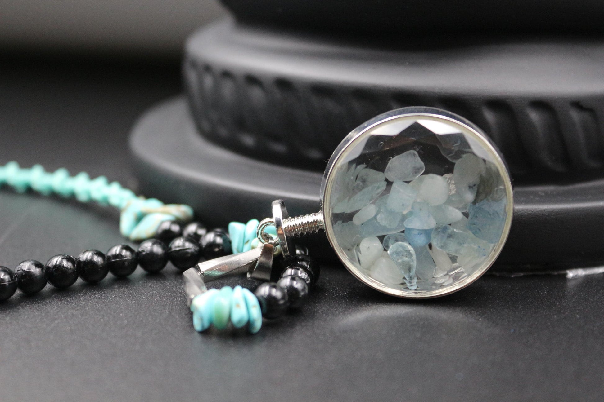 This unique handmade necklace combines a nautical theme with natural stones, creating a fresh and original look. The central element is a sphere-shaped pendant filled with aquamarine, complemented by a strand of turquoise and black beads.