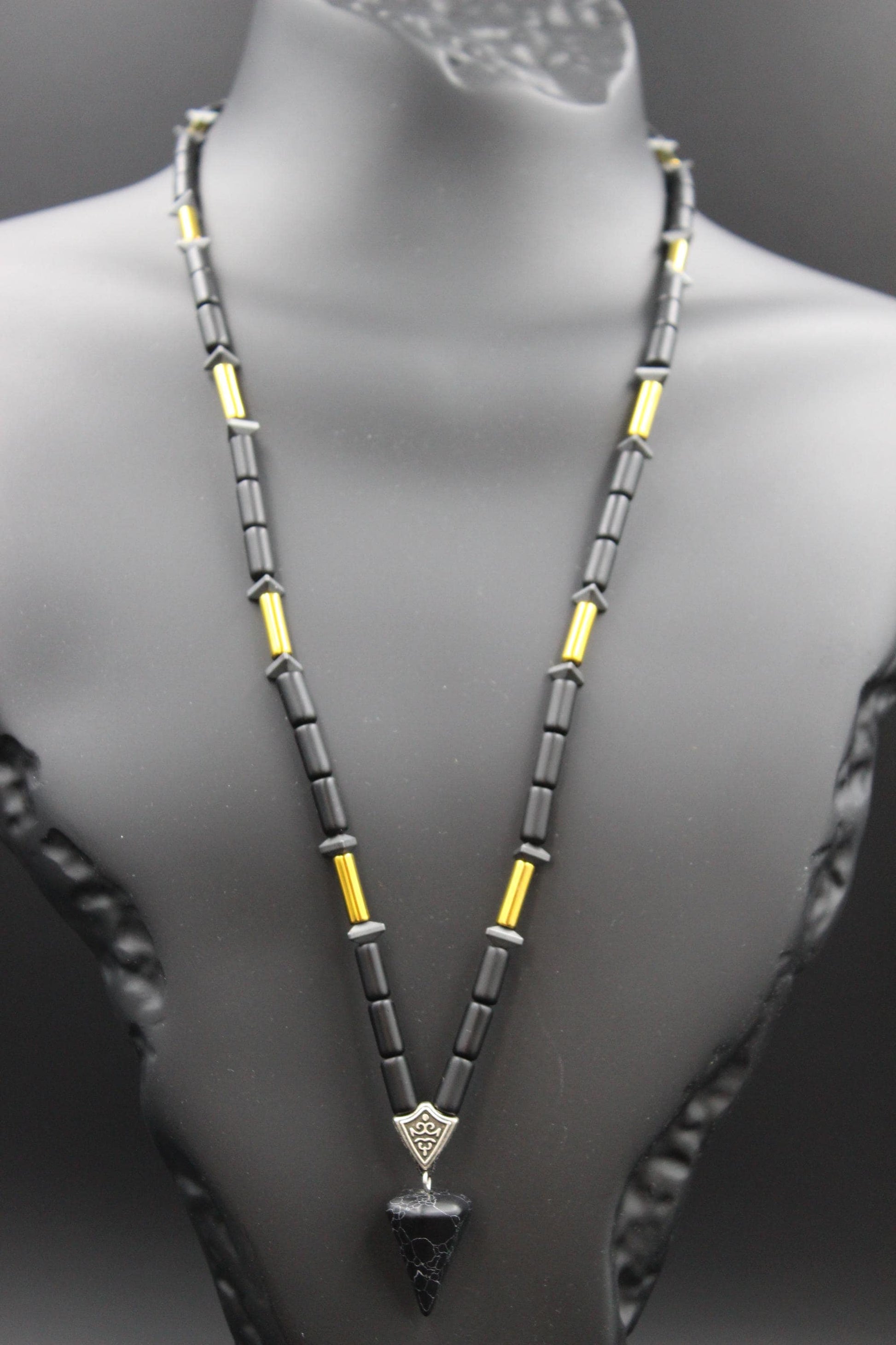 Black Onyx: Long black onyx beads are placed along the entire length of the necklace, adding ruggedness and strength. Onyx symbolizes protection, willpower, and confidence.