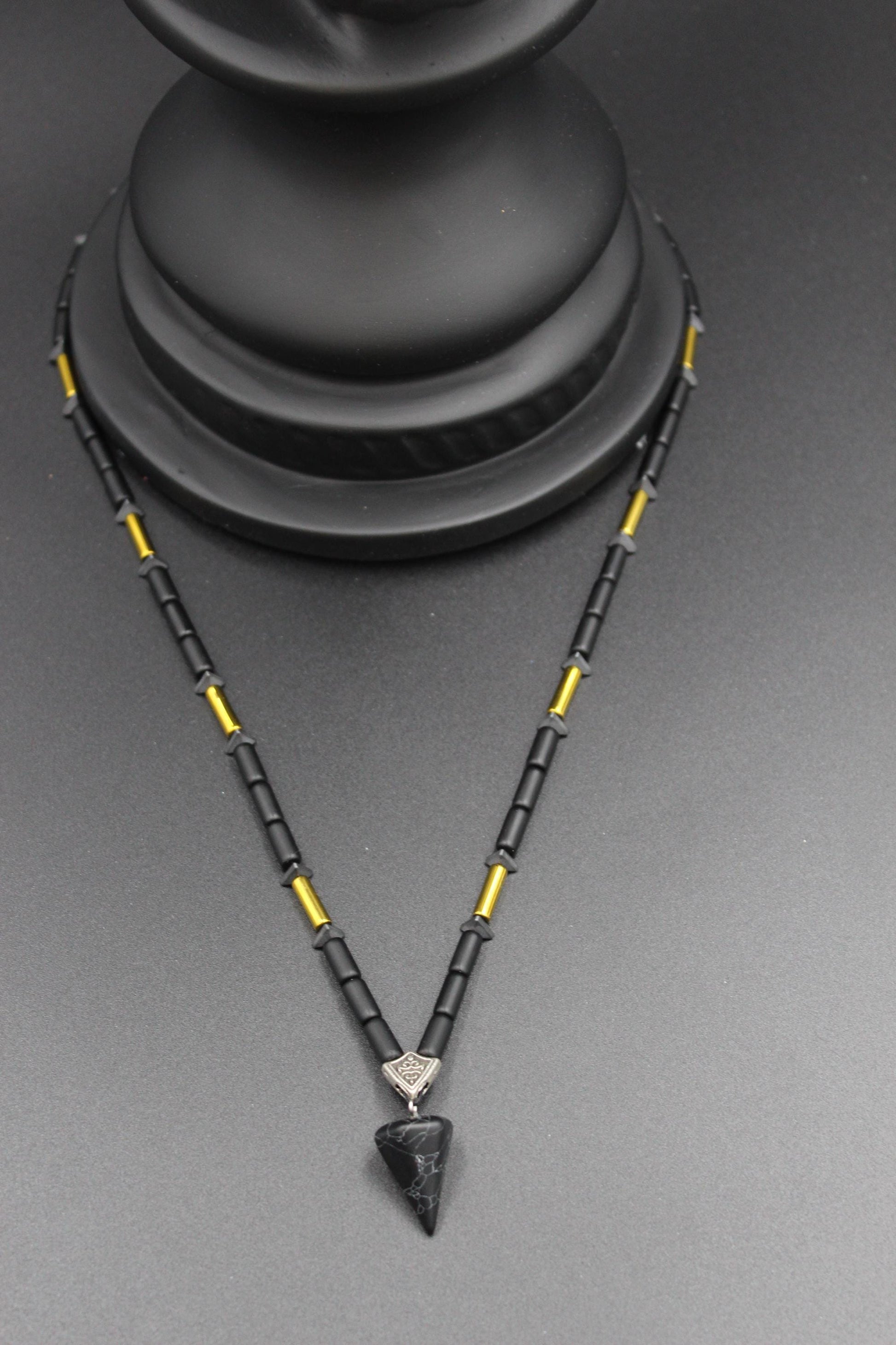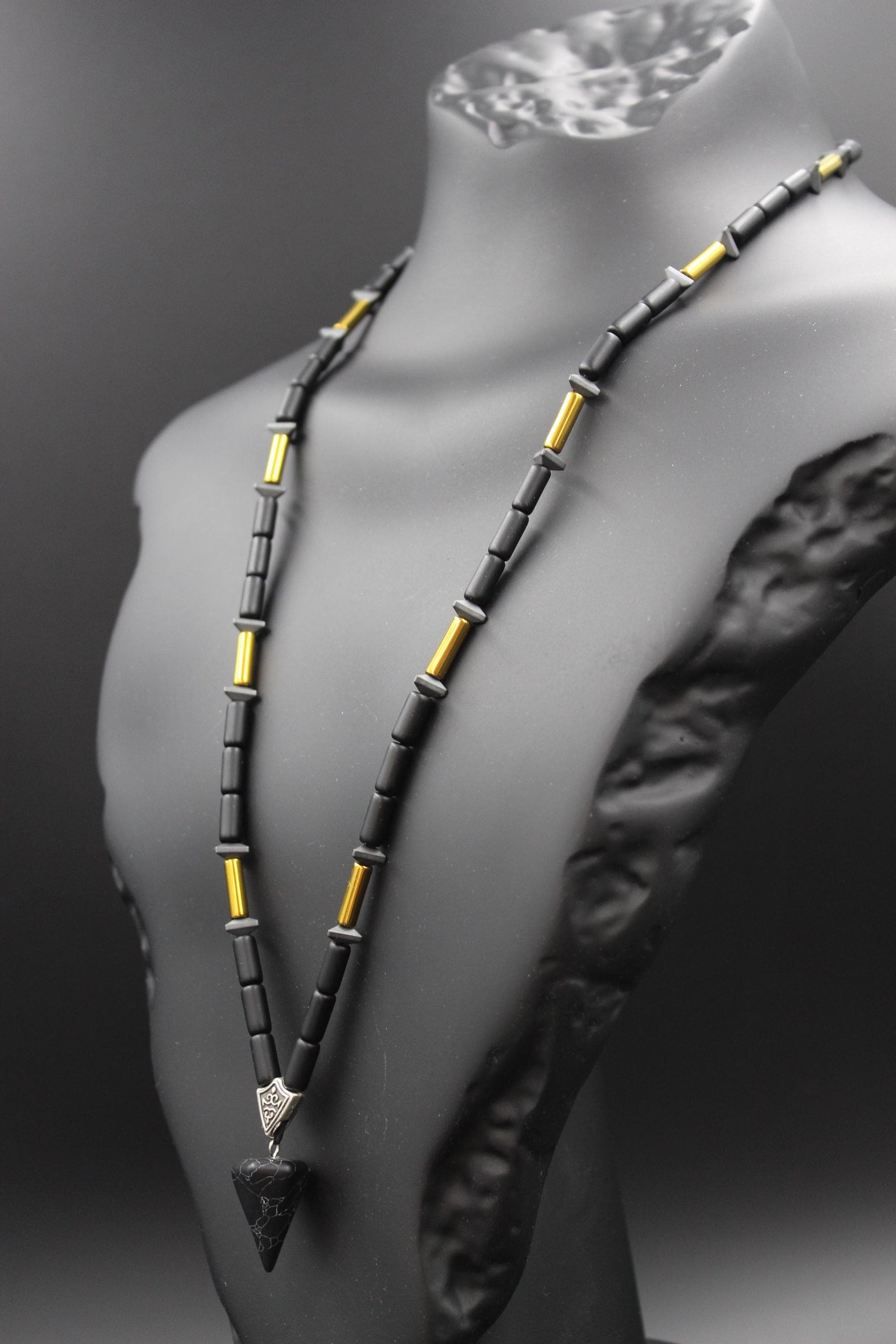 This exquisite handmade necklace combines the deep black color of quartz and onyx, as well as the metallic shine of hematite, creating a stylish and powerful accessory with a unique design.
