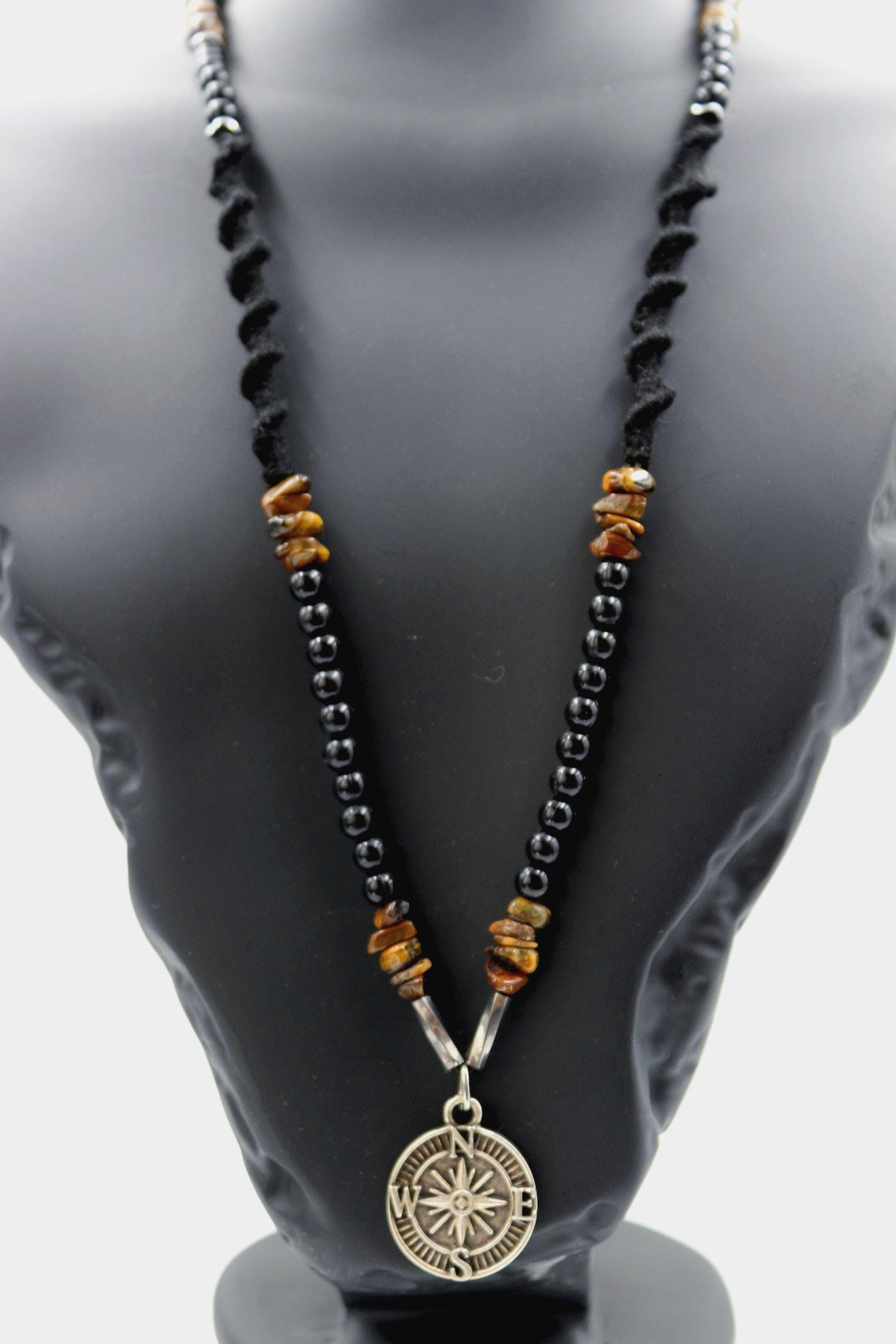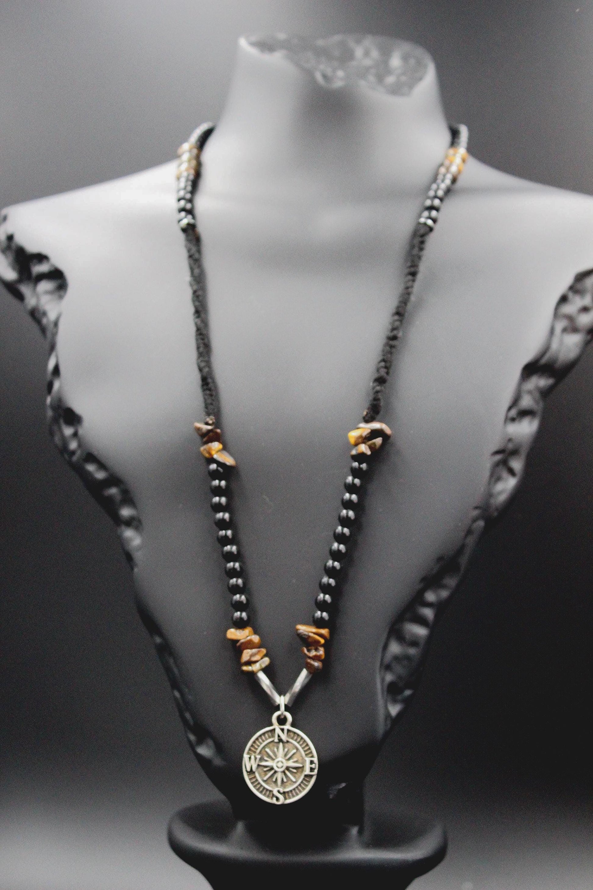 Handmade Men's Natural Stone Necklace – Tiger's Eye with Compass Pendant, Unique & Special Design