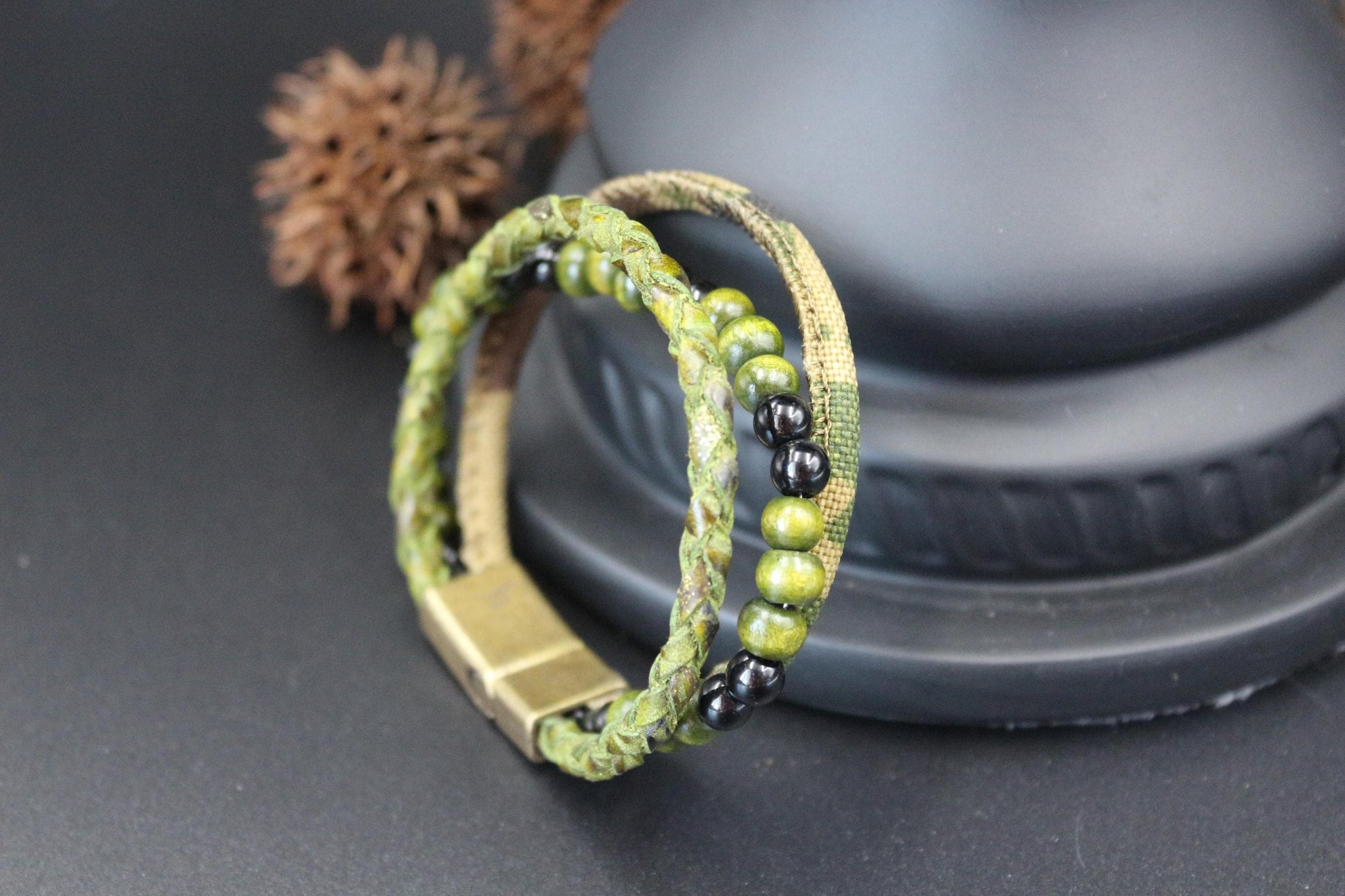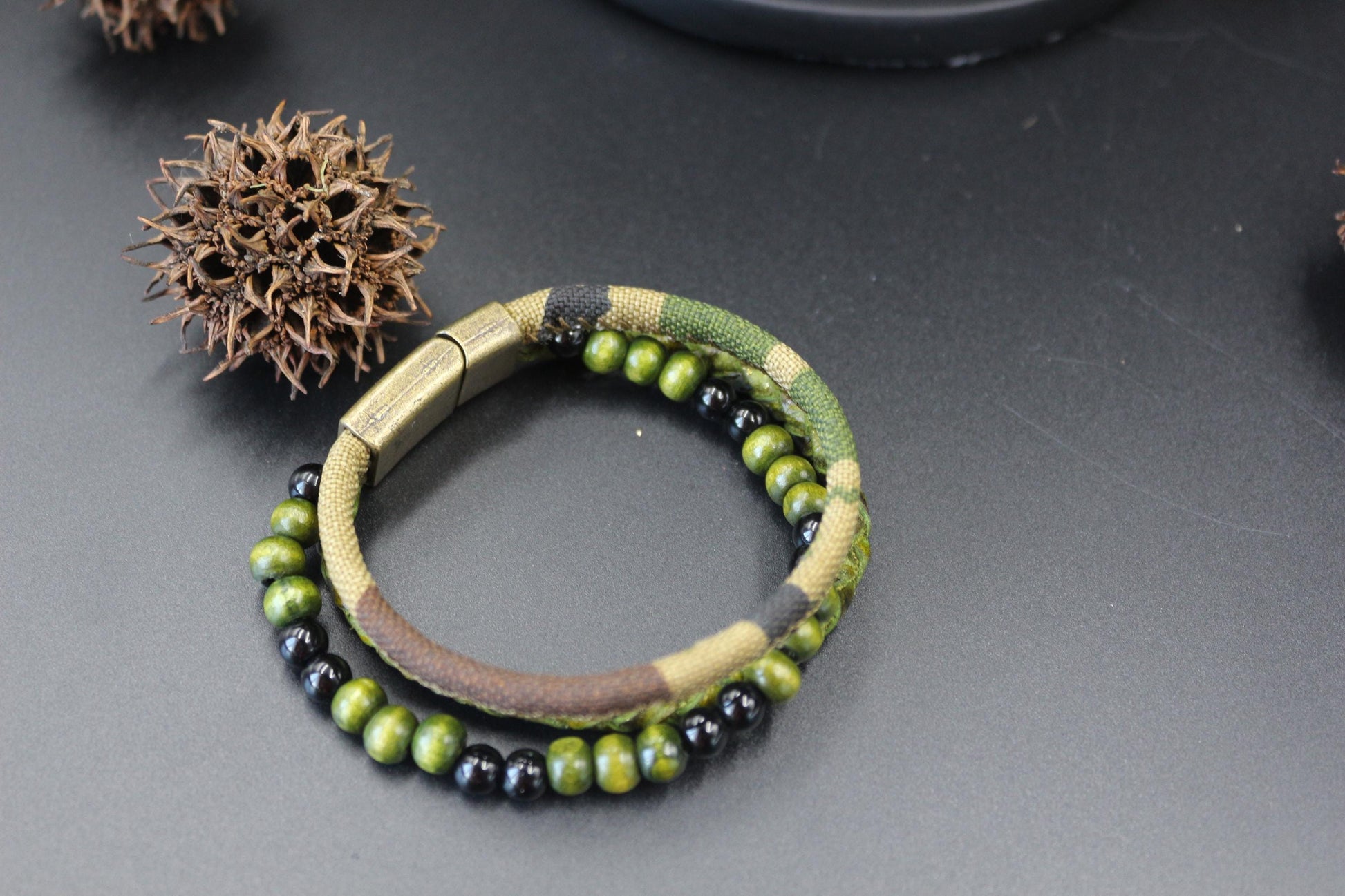 This rugged and stylish men's handmade bracelet is crafted in a military camouflage style, combining the durability of genuine leather and the natural warmth of wooden beads. It will be the perfect addition to the image of a real man who values freedom and adventure.