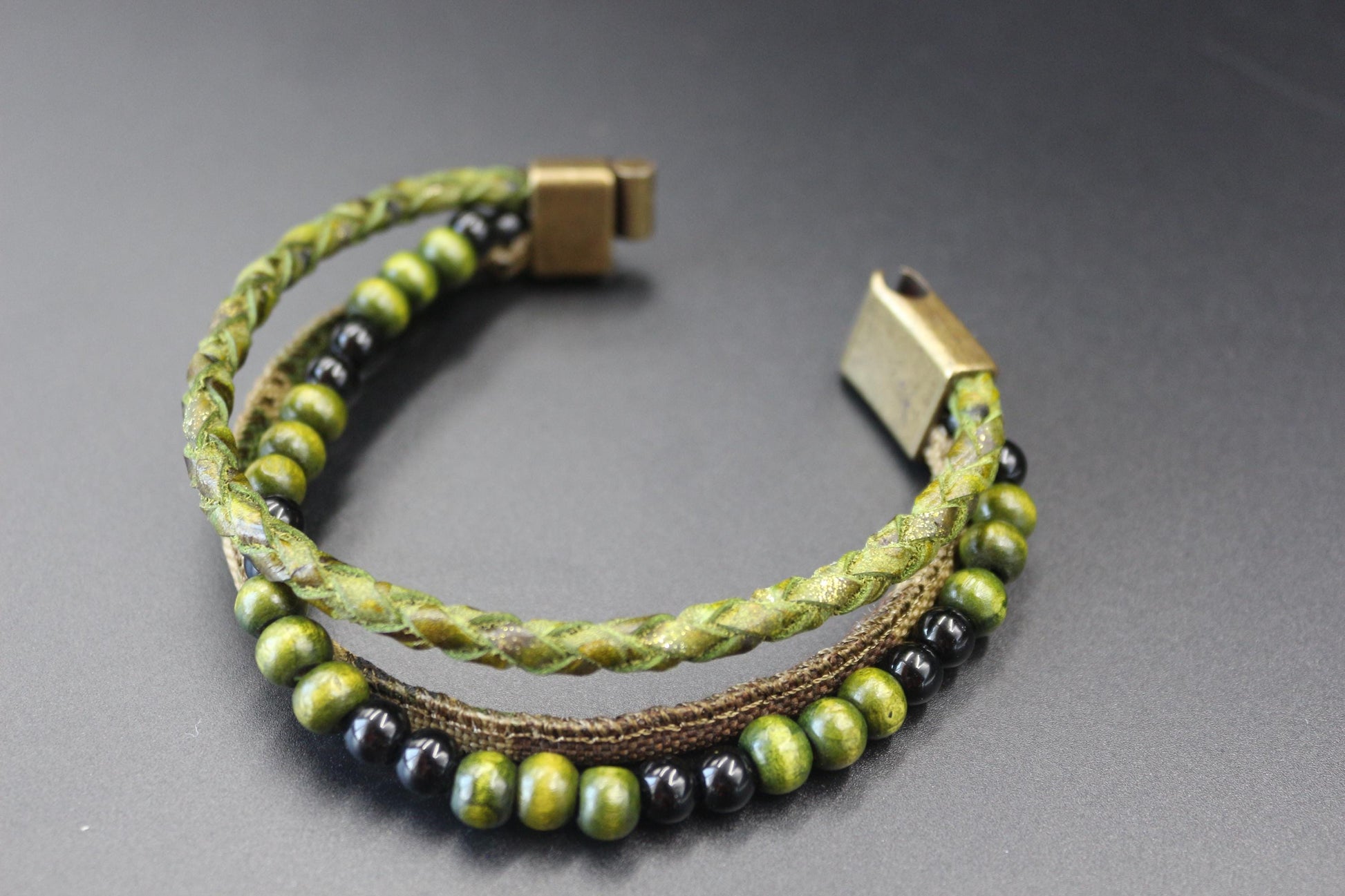 Wooden Beads: Along one of the straps are beads made of natural wood, painted in an olive-green color. They add natural texture and warmth to the bracelet.
