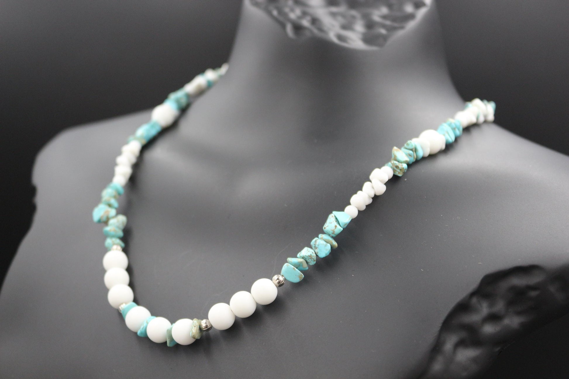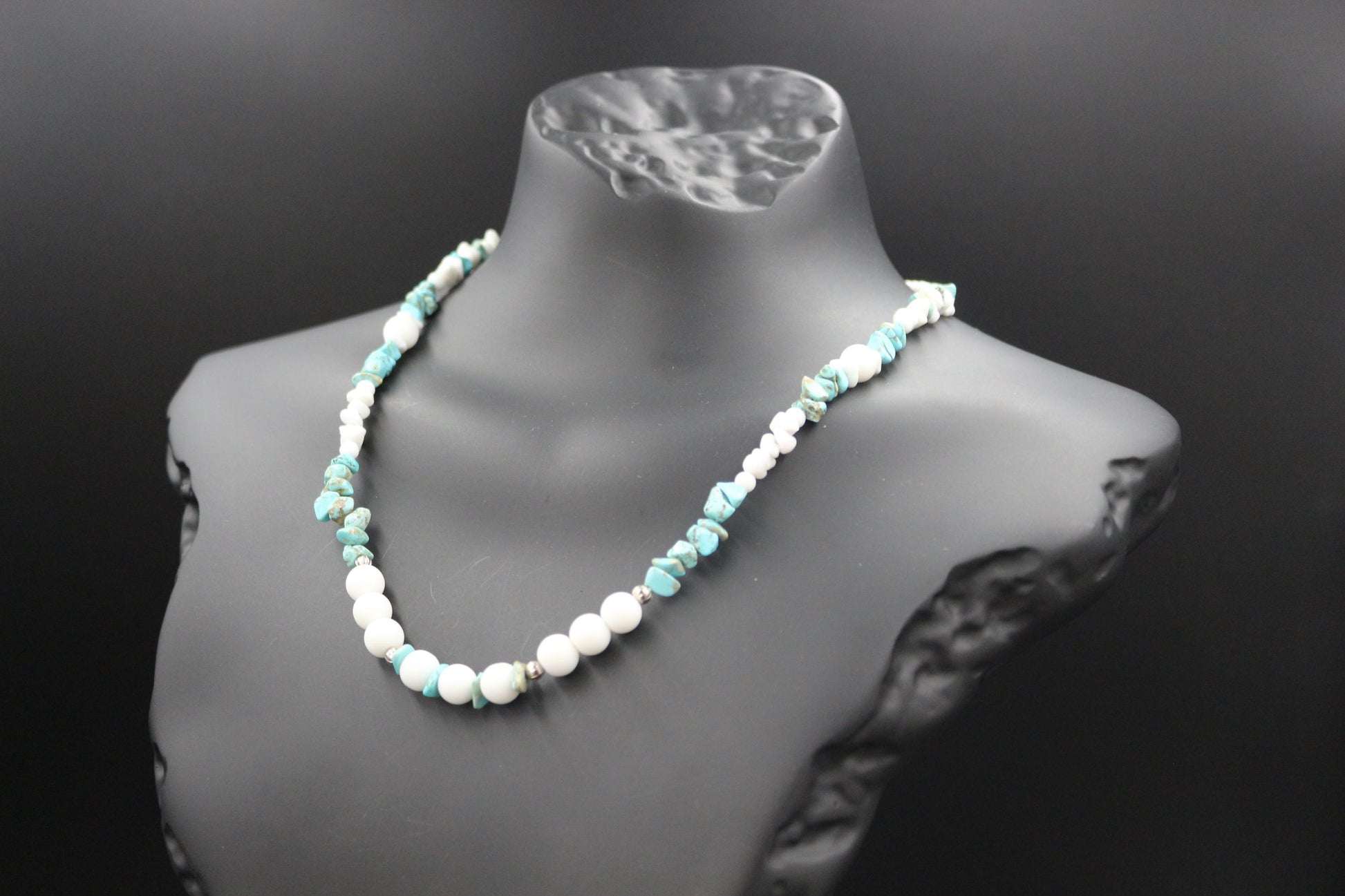 Elegant and refreshing, the "Arctic Breeze" necklace embodies the purity of icy landscapes and the serenity of ocean waves. This handcrafted piece features a harmonious blend of white howlite beads, turquoise chips, and silver accents, creating a timeless and versatile design.