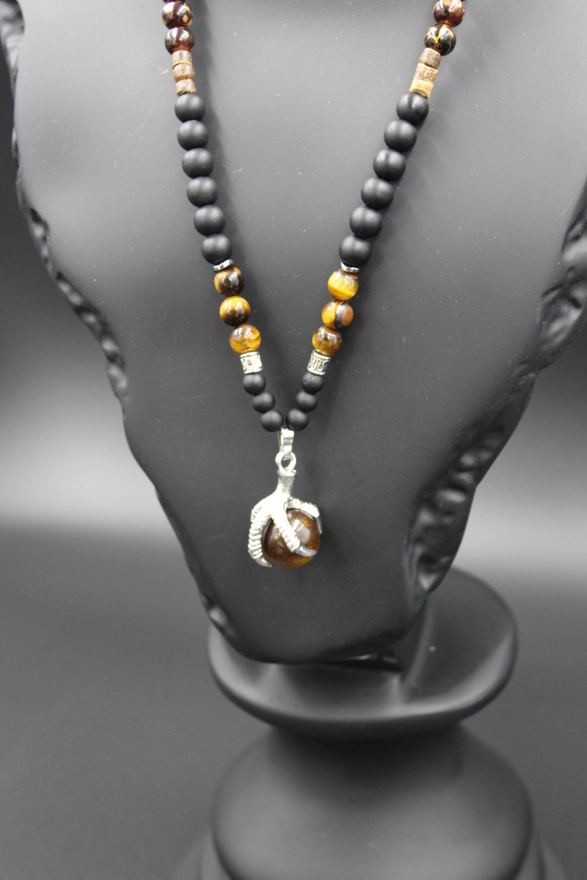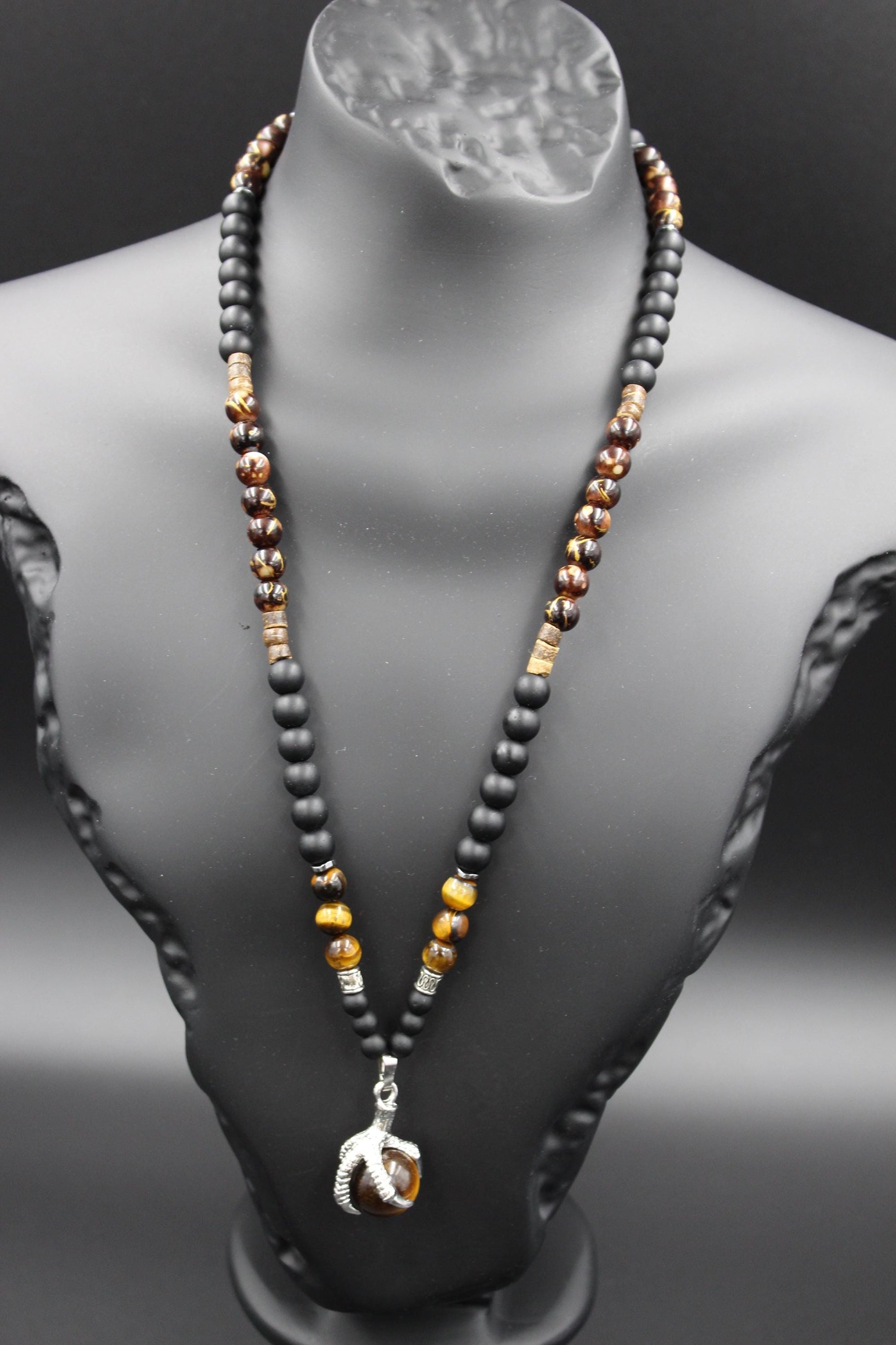Handmade Necklace with Natural Tiger's Eye, Onyx, and Wooden Beads. Unique Design