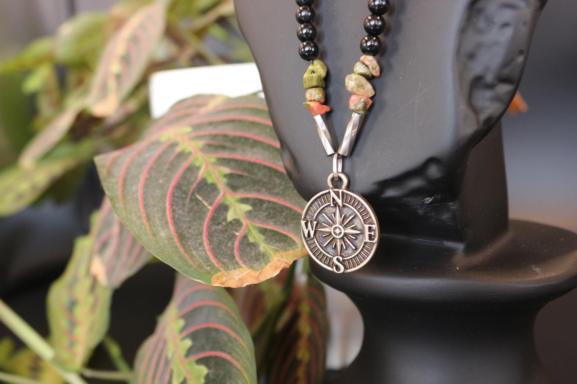 Compass Pendant: At the bottom of the necklace is a compass pendant. The compass is a symbol of direction, travel, finding one's path, and making decisions. The pendant may be made of metal and have a detailed design.
