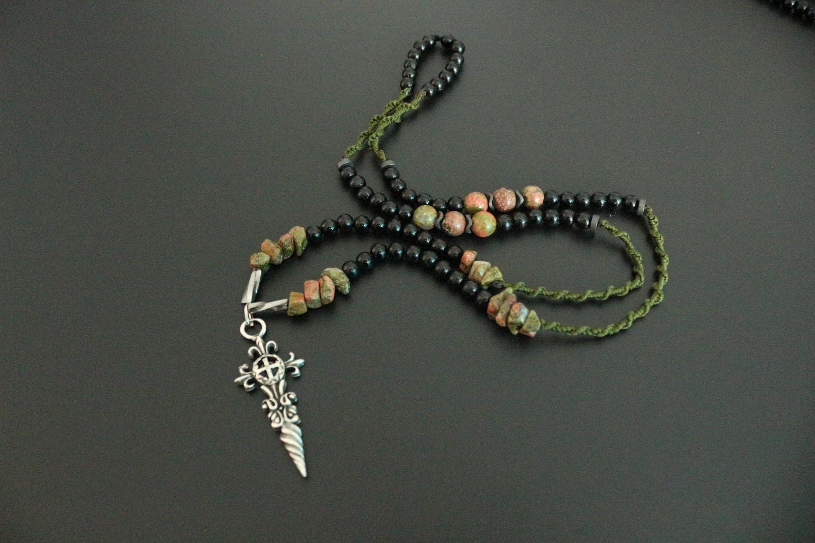 This handmade men's necklace features a stunning Unakite natural stone, known for its grounding and healing properties. With its unique blend of green and pink hues, Unakite represents balance, emotional healing, and personal growth.