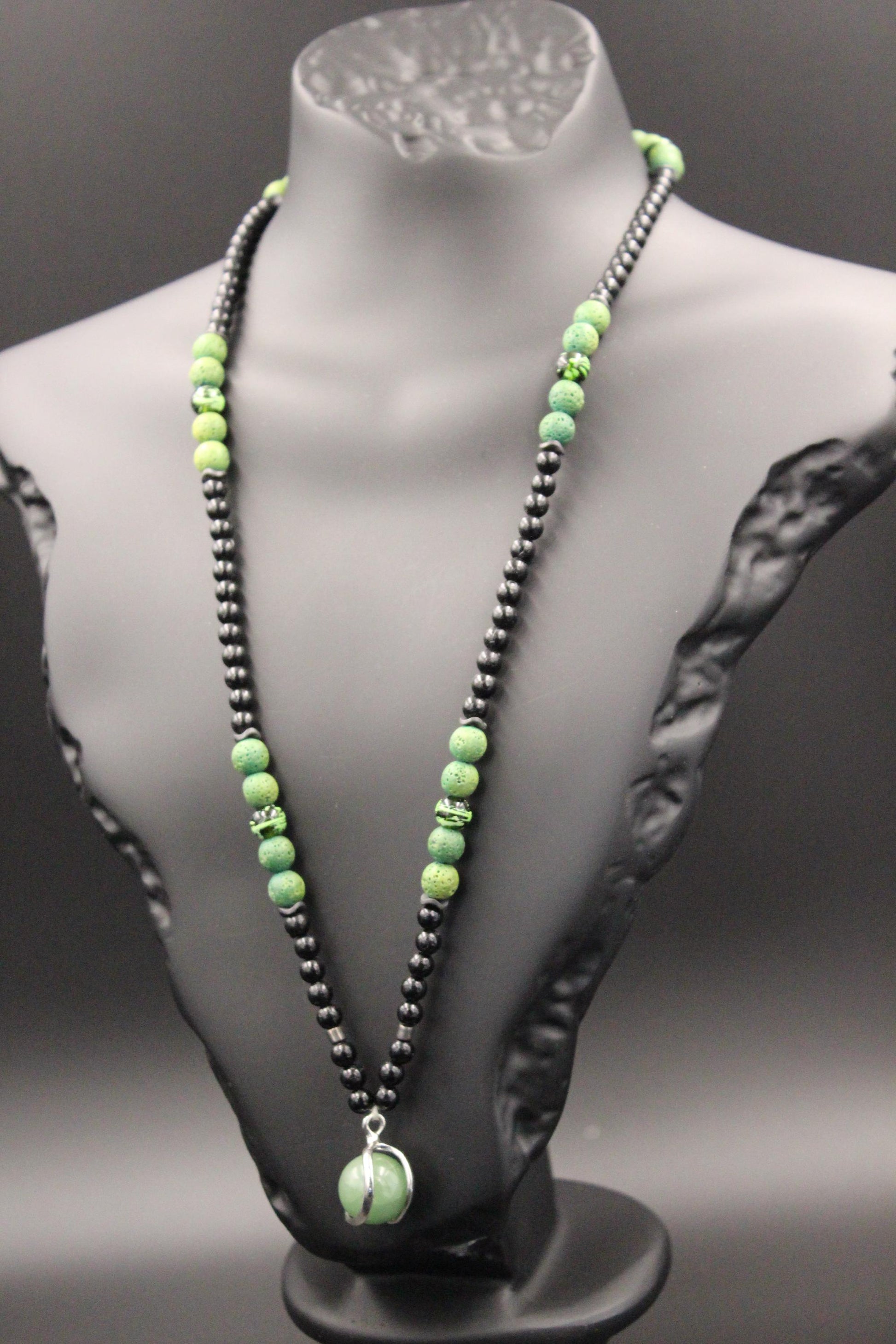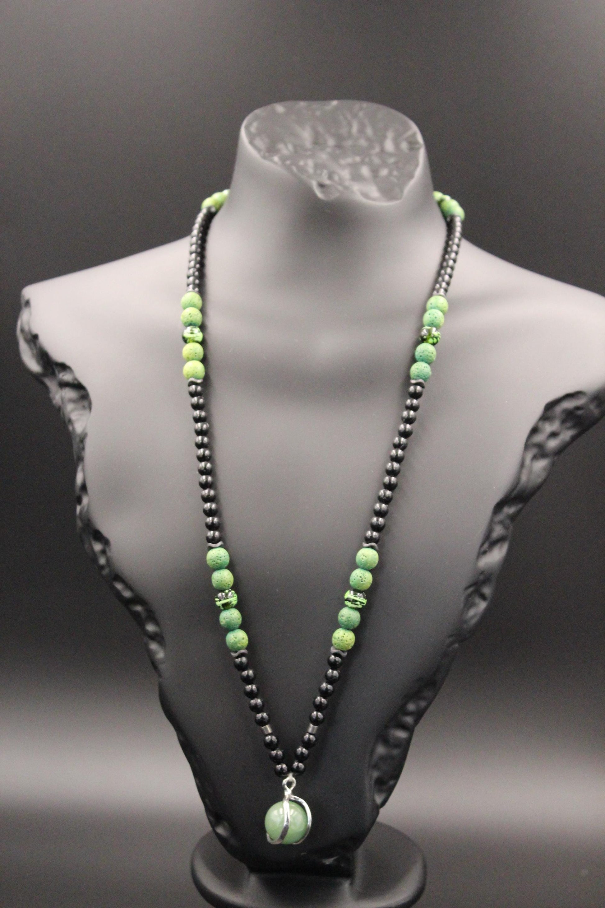 Feel the harmony of nature with this unique handmade necklace, combining the natural beauty of green agate and the power of volcanic stone. This necklace is the perfect accessory for those who appreciate natural materials and their energetic properties. ✨