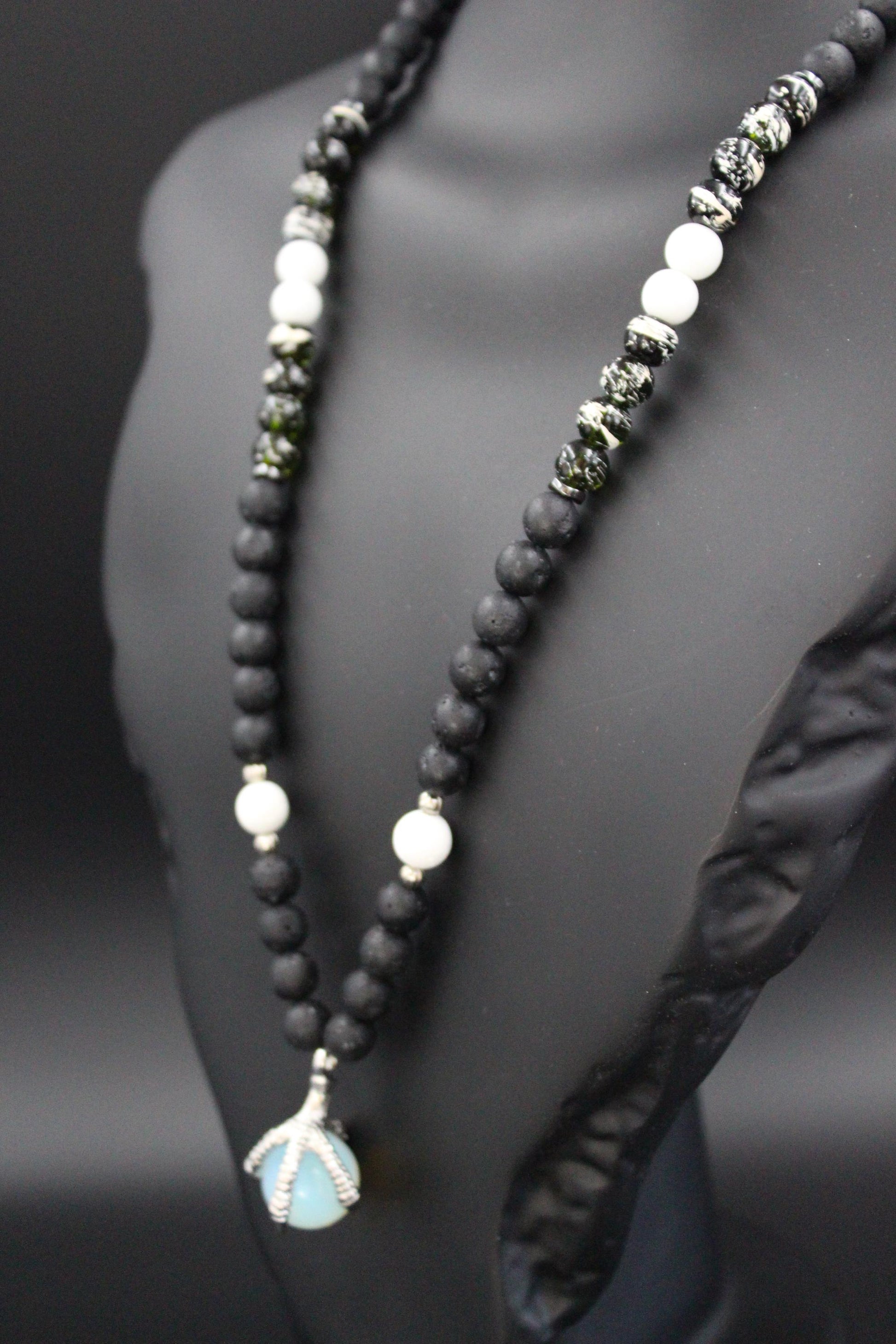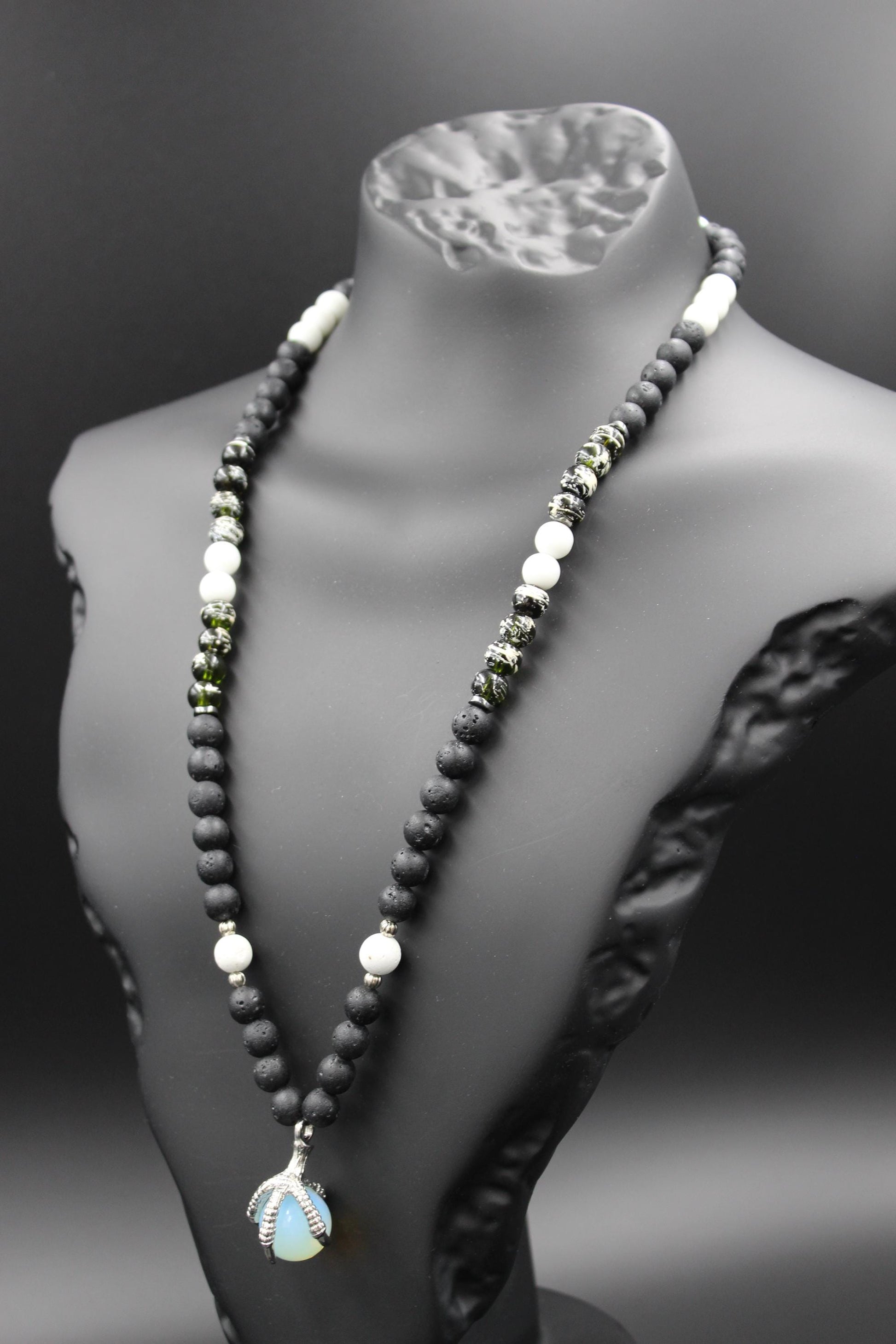 This unique handmade necklace combines the raw beauty of volcanic stone with the mystical charm of an opalite gemstone and a striking "Bird Claw" pendant. Crafted with care, this piece draws inspiration from ethnic traditions and serves as a powerful amulet.