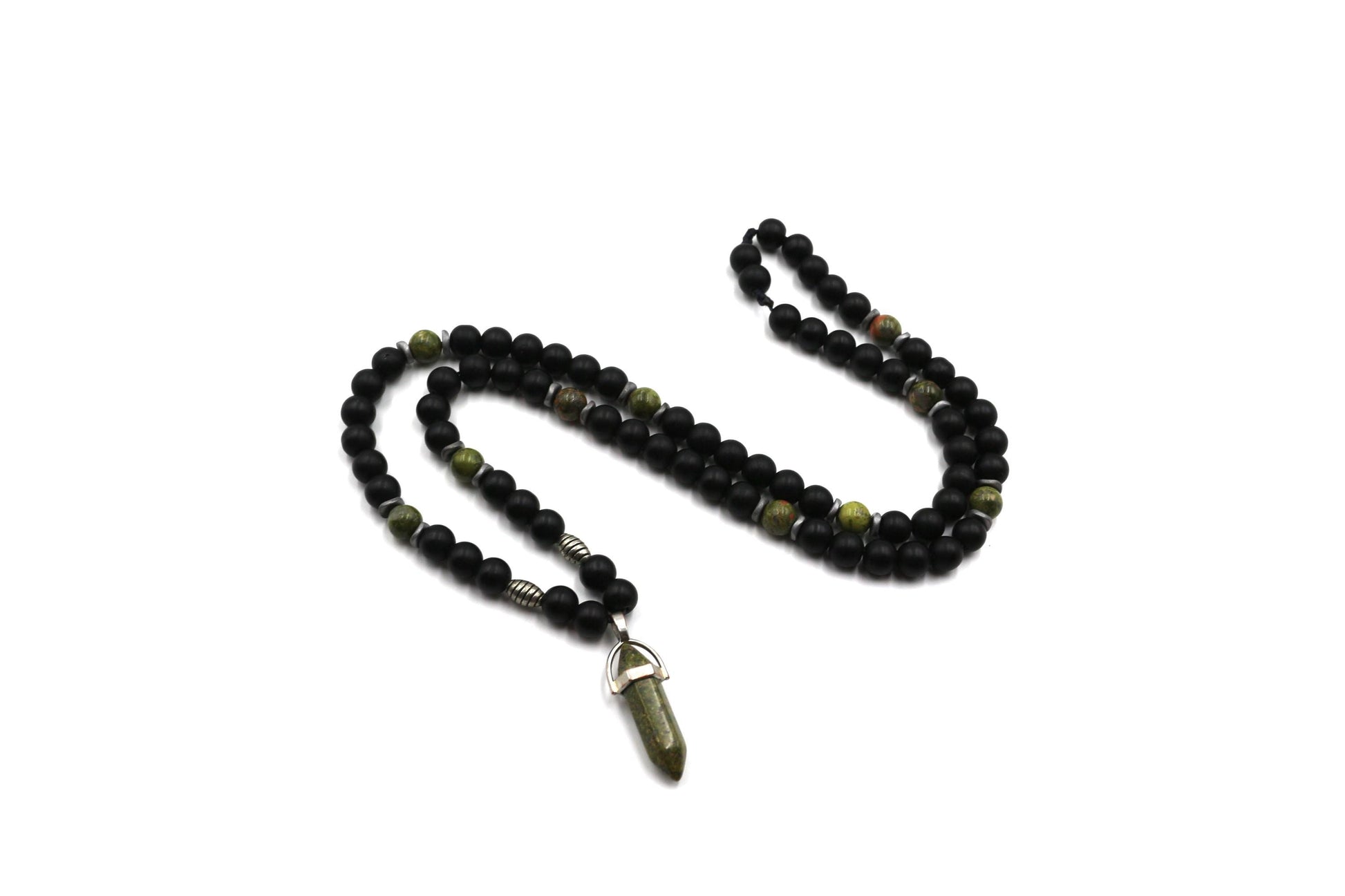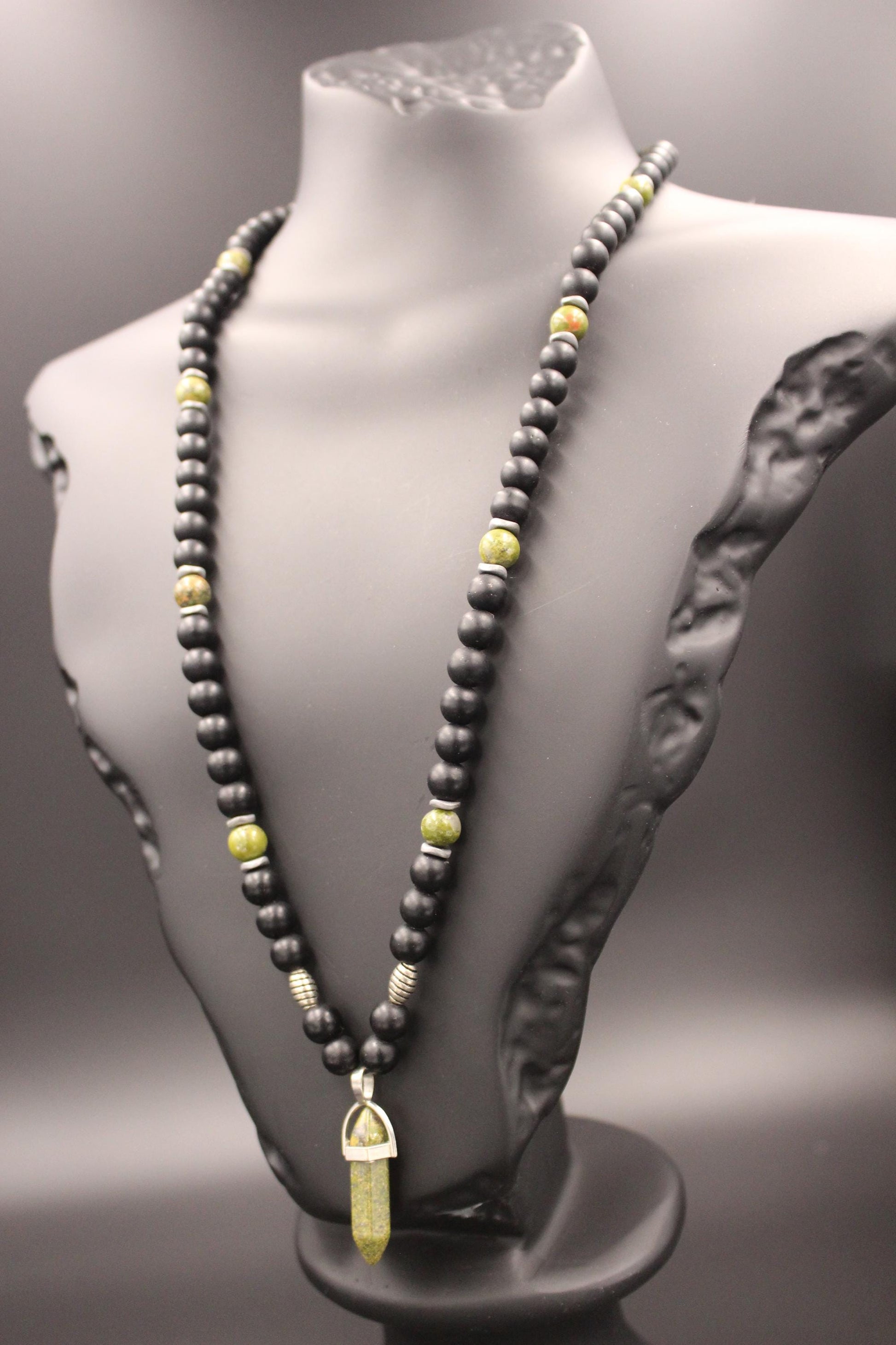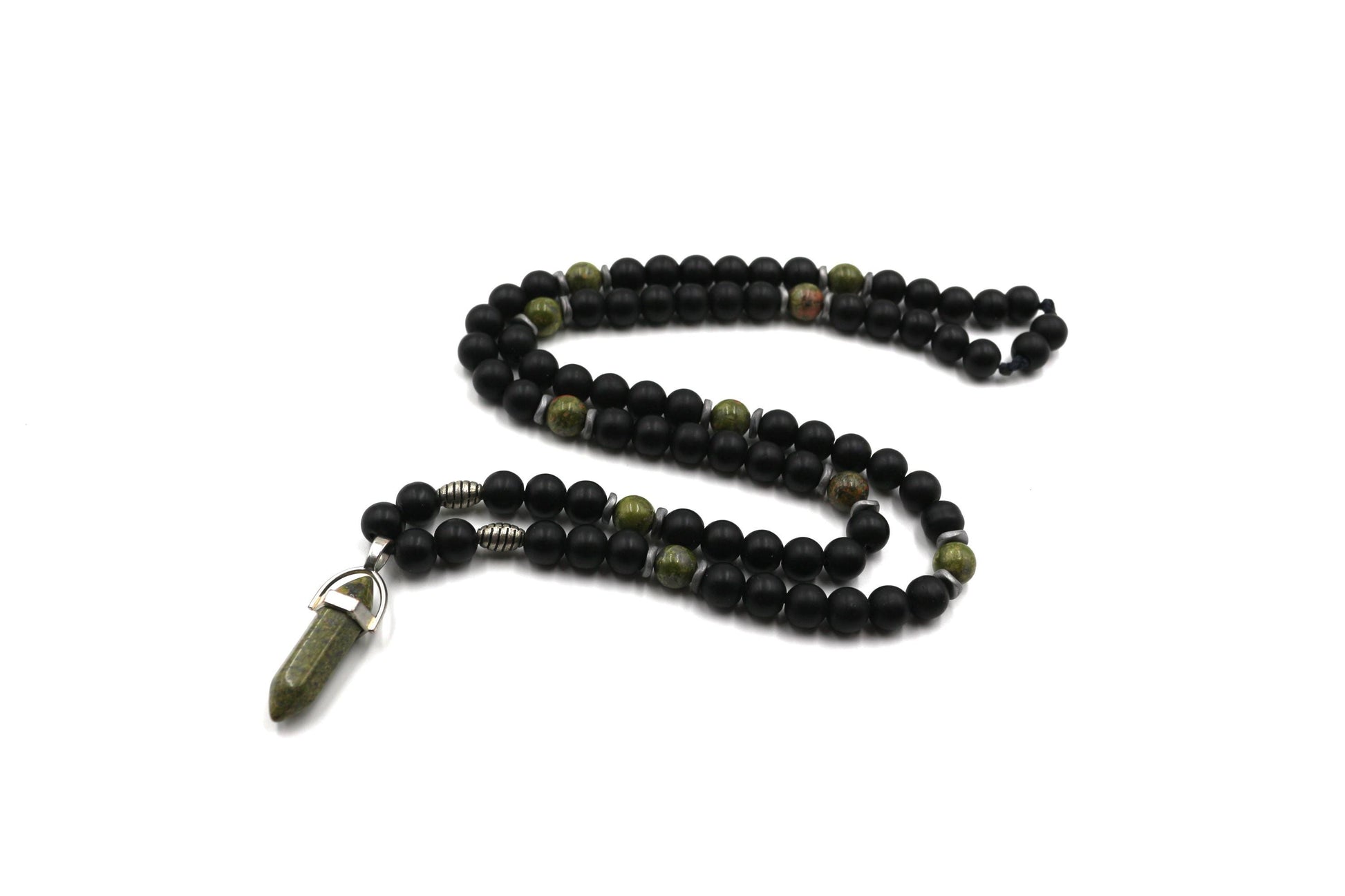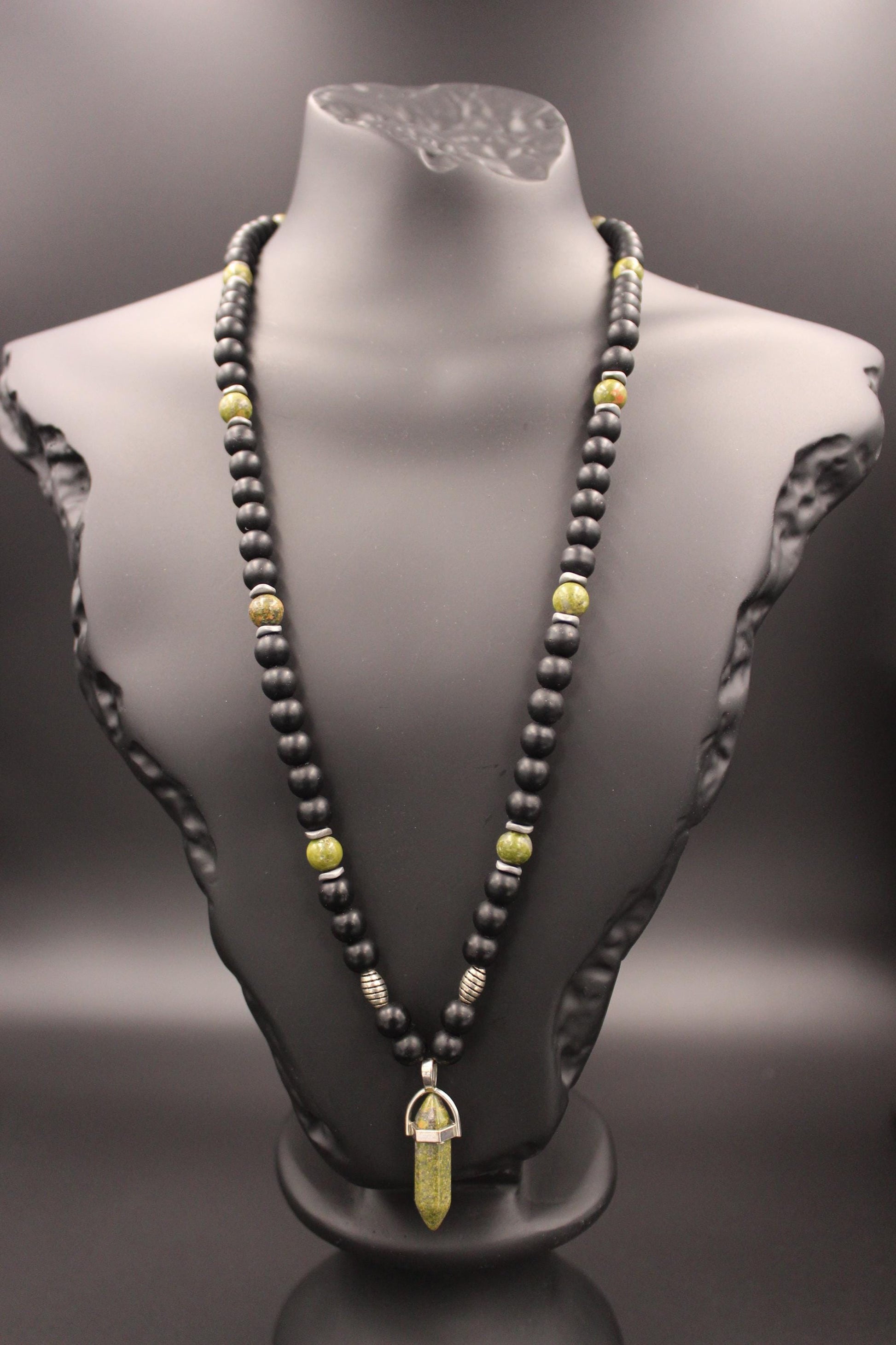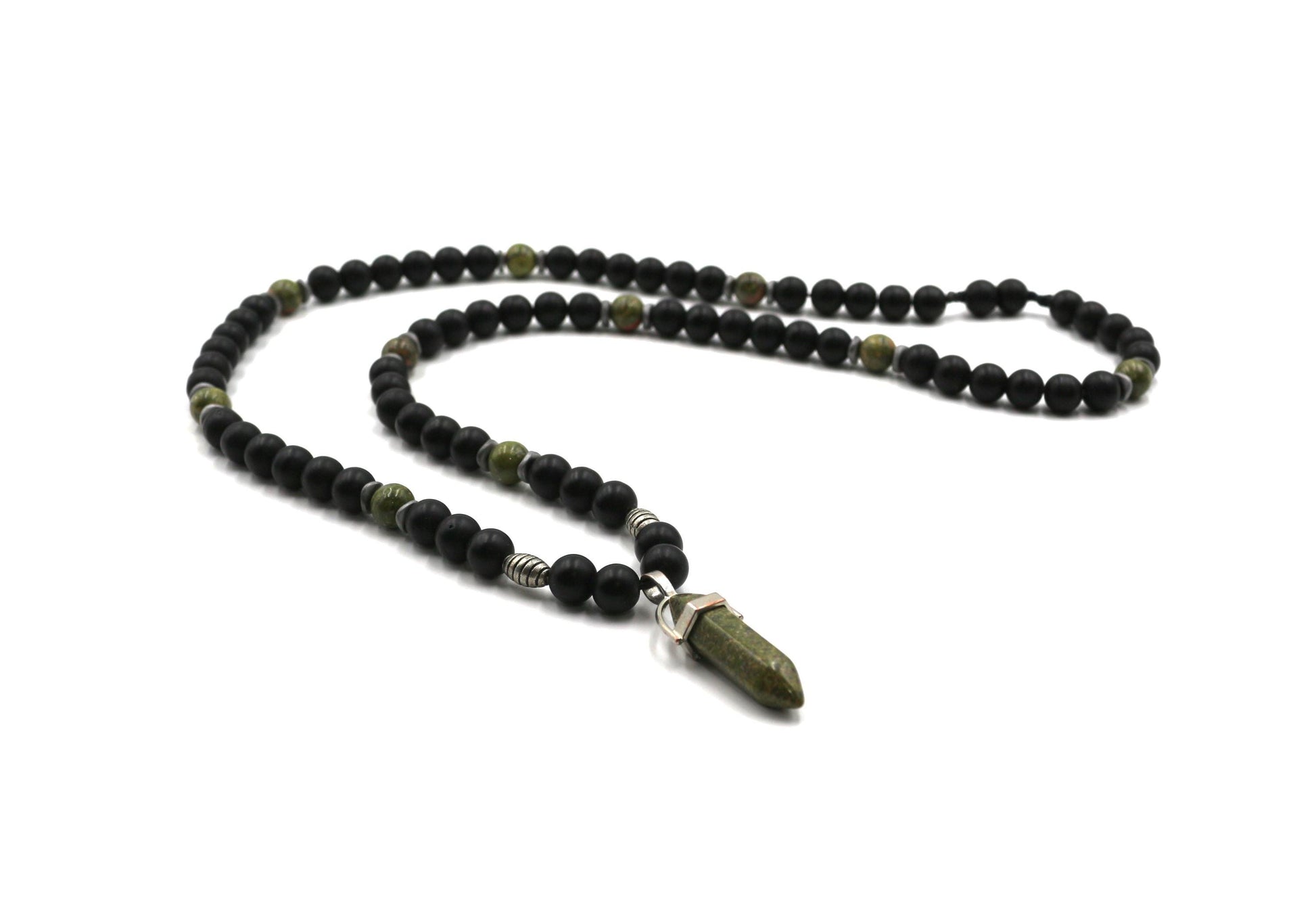 Necklace - Unakite, Black Onyx, and Hematite Handmade Natural Stone – Unique Design Green Gemstone Necklace