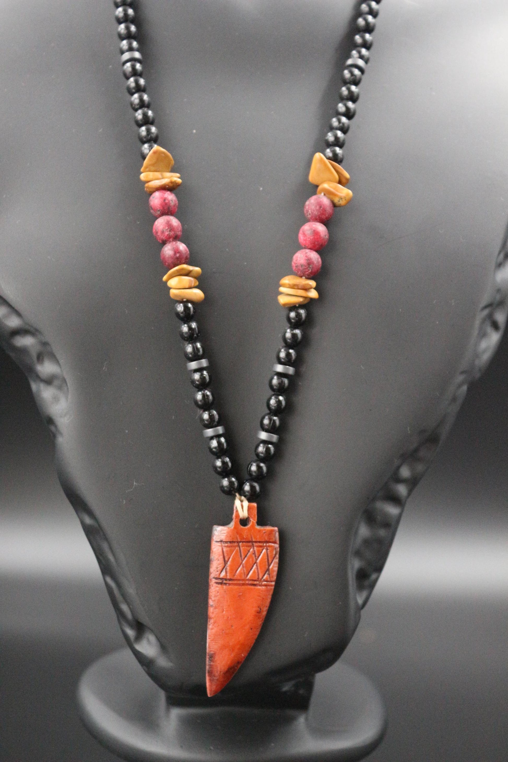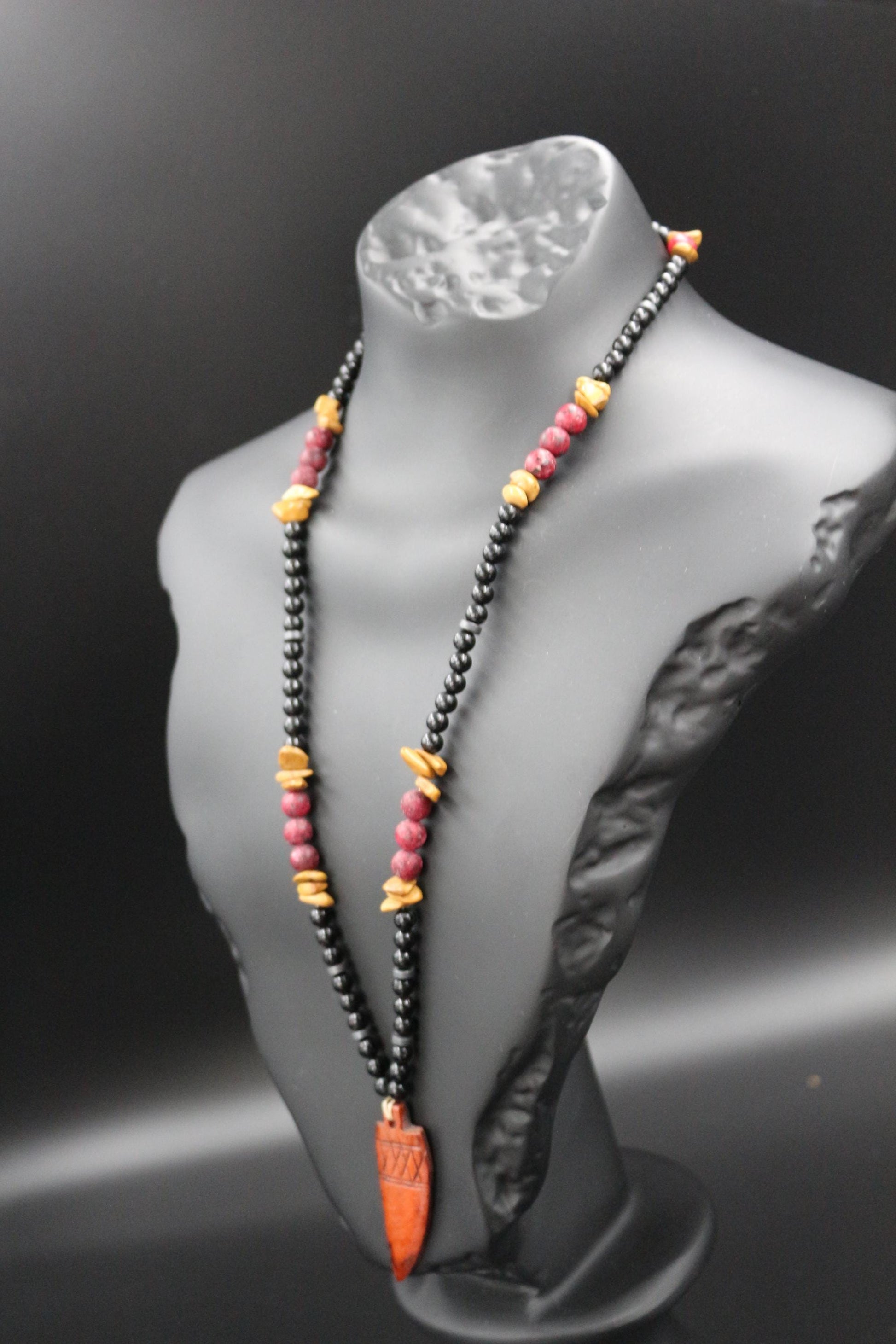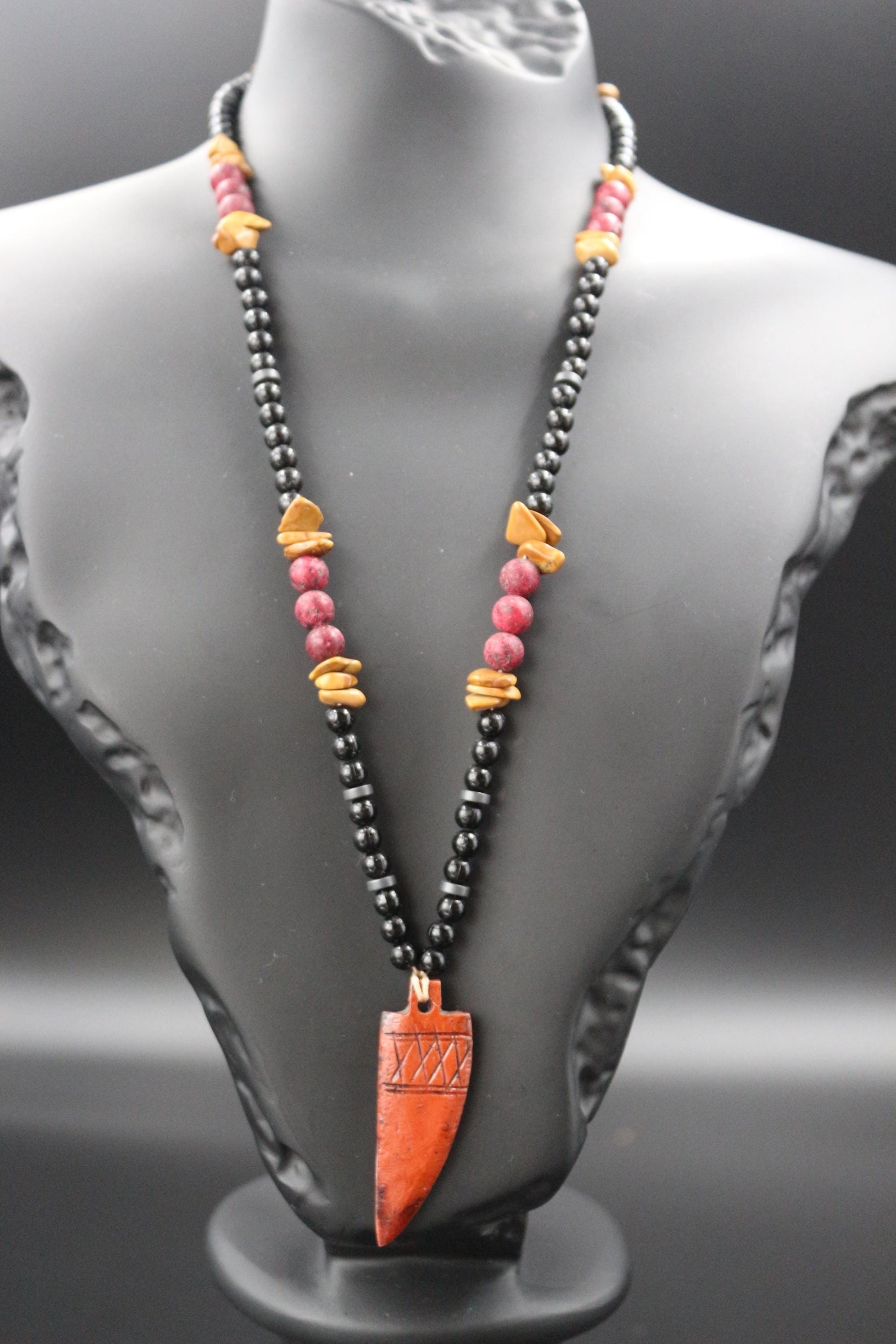 This unique handmade necklace combines the energy of natural stones with ethnic motifs, creating a bright and original look. The central element is an amulet, complemented by a strand of yellow jasper, garnet, hematite, and black beads.