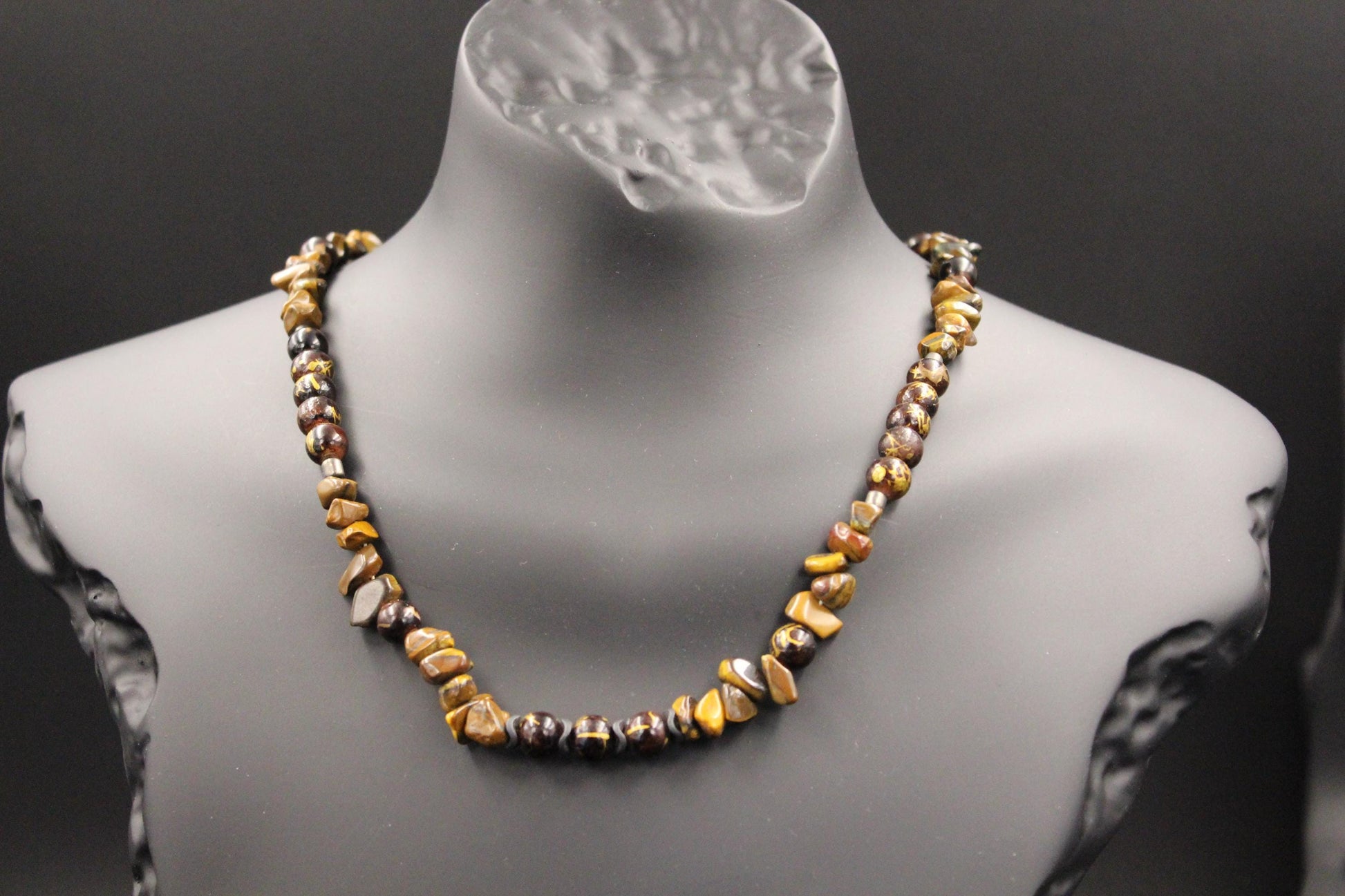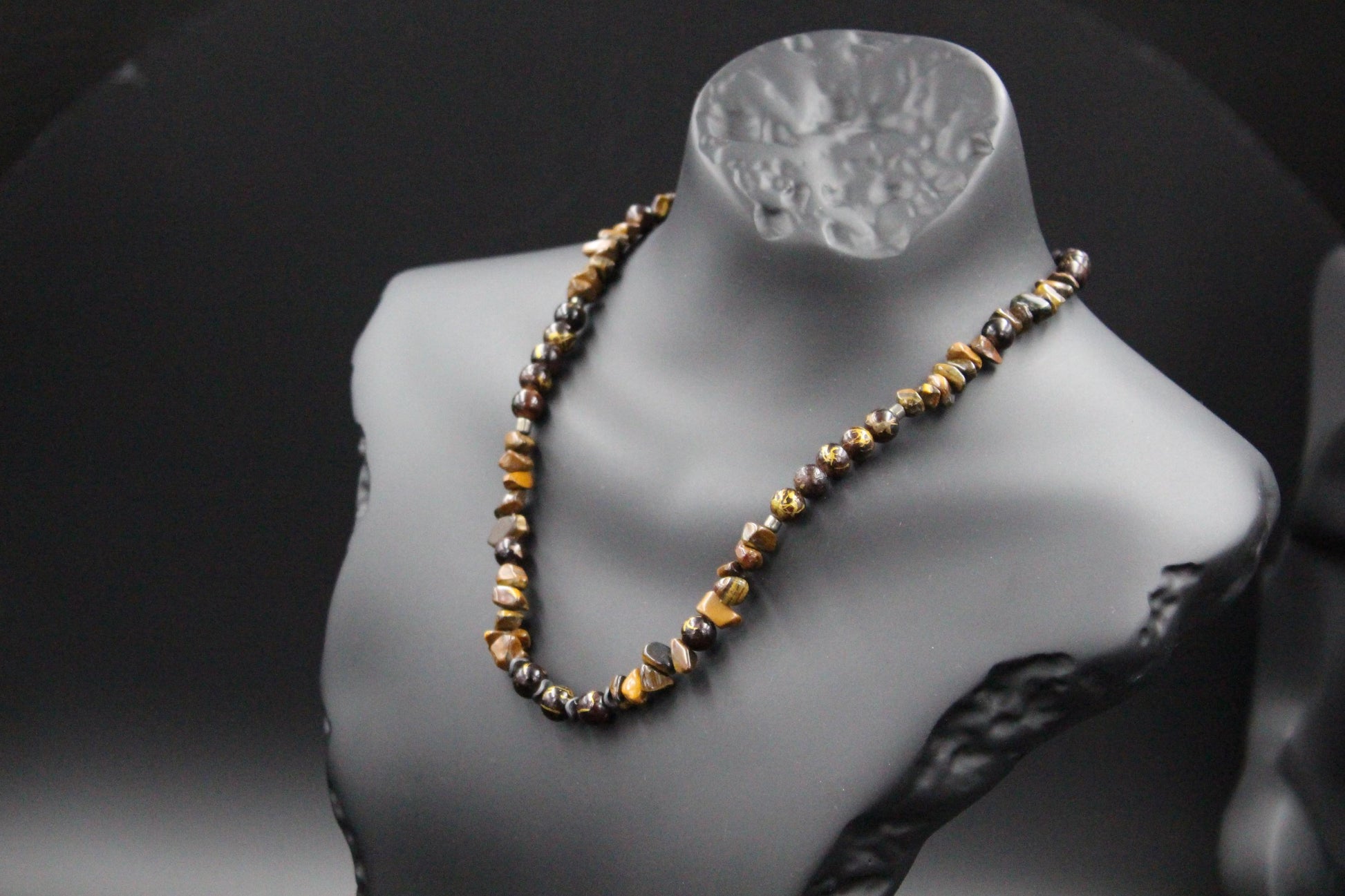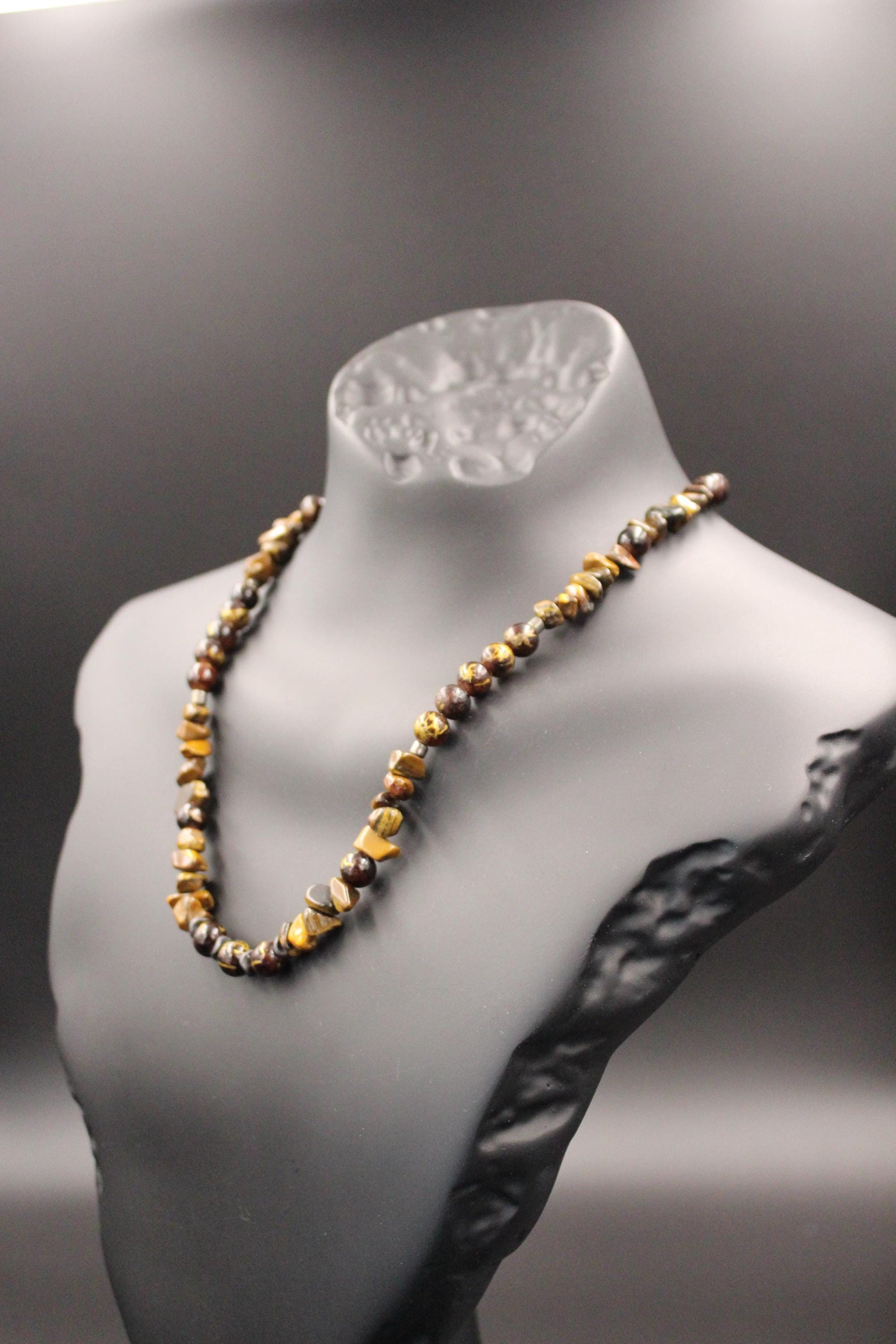 Color Palette: The necklace is made in warm golden-brown tones with the characteristic iridescent effect inherent in tiger eye.