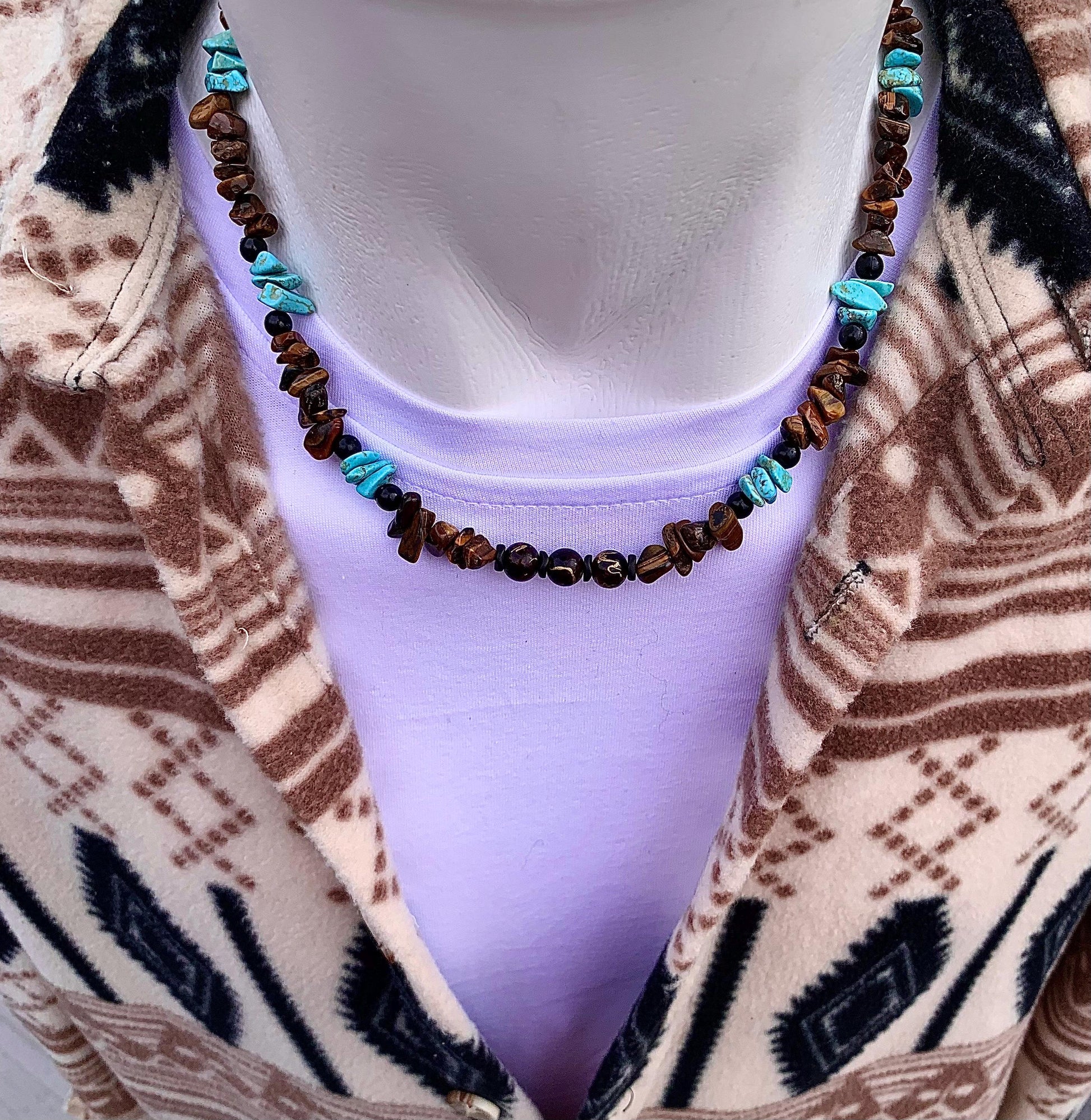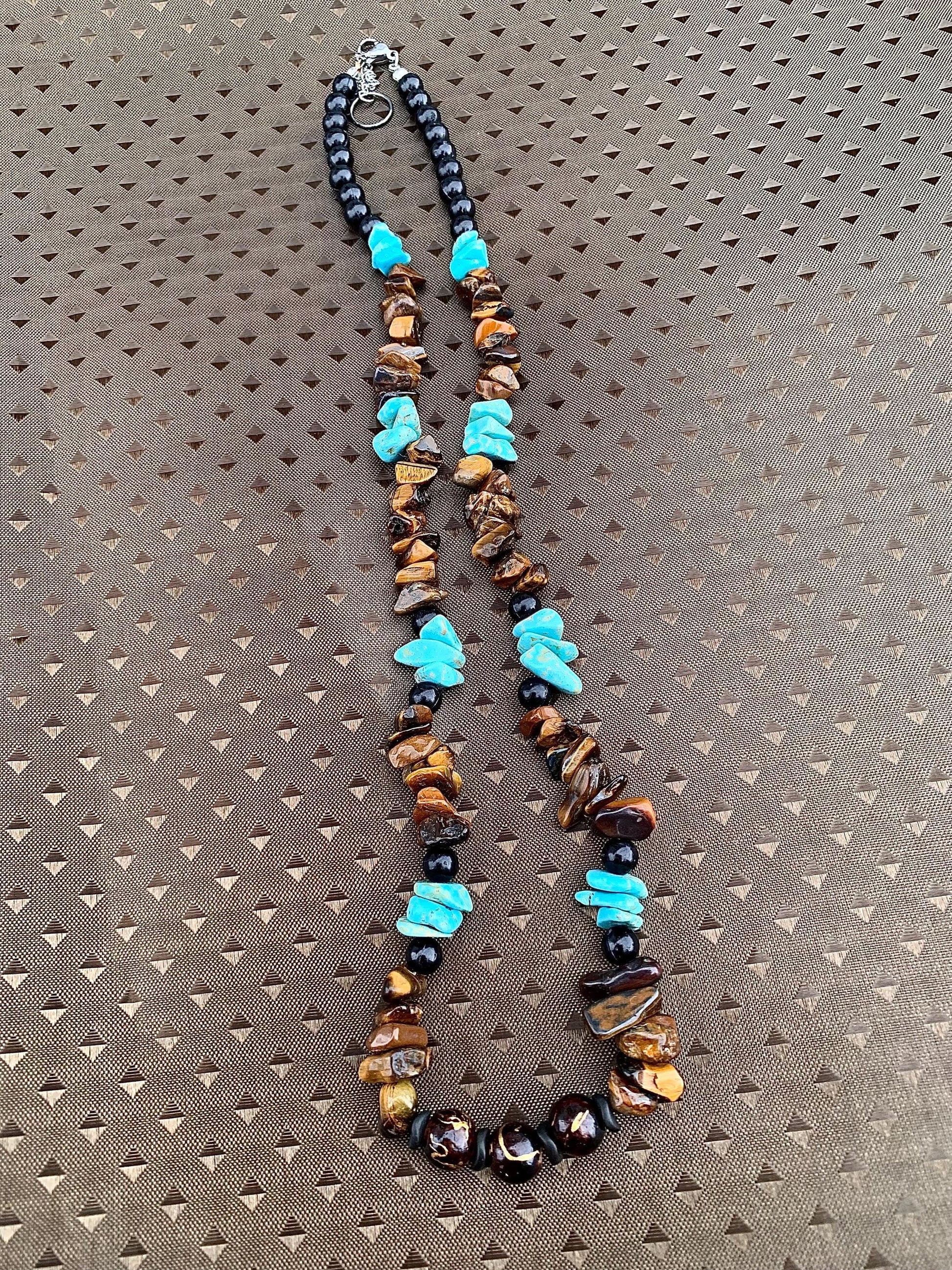 Tiger eye and turquoise stone, which are both spiritually and aesthetically valuable, symbolize strength and balance. This necklace is a perfect choice for those looking for simple elegance.