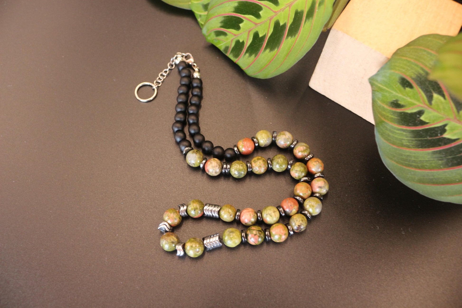 Stone Alternation: The alternation of unakite, hematite, and black onyx creates visual interest and a harmonious combination of energies.