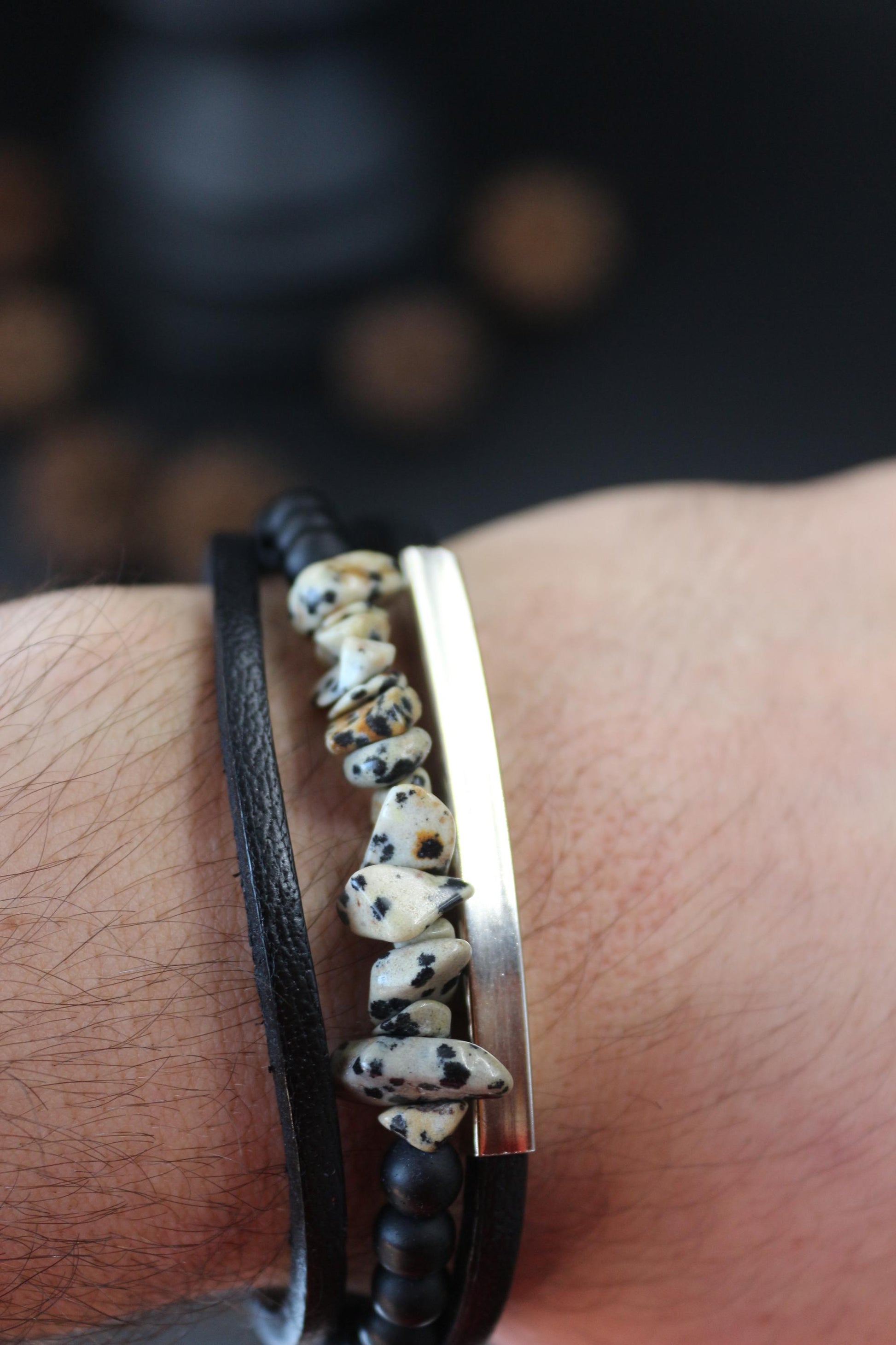 Контраст материалов: Сочетание далматинской яшмы, черного оникса и натуральной кожи создает гармоничный контраст, подчеркивающий индивидуальность владельца.