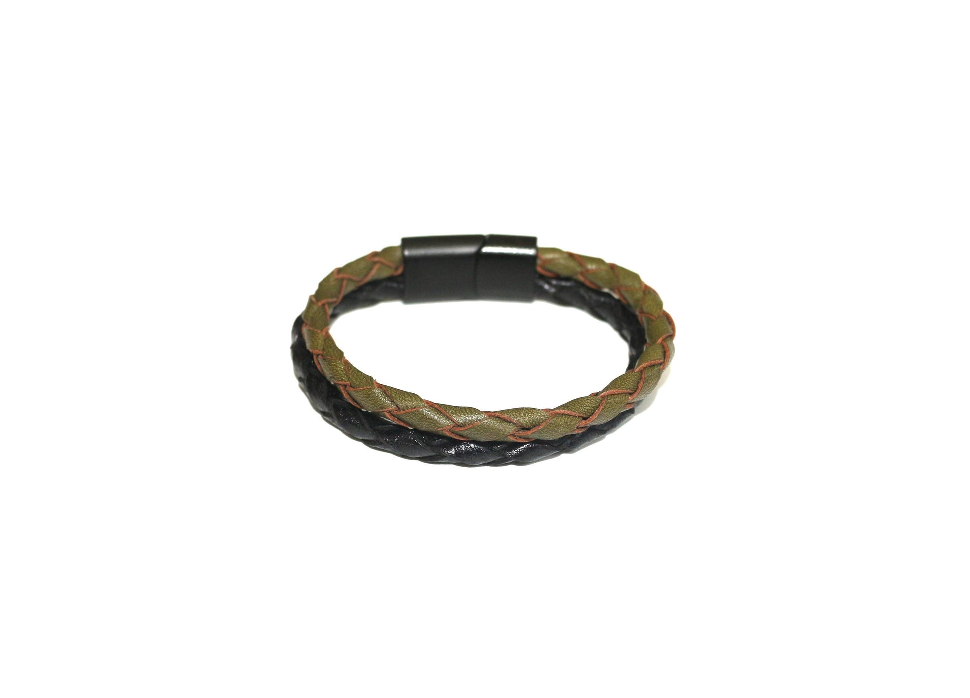 Двойная плетёная нить: браслет состоит из двух плетёных ремешков из натуральной кожи. Один ремешок чёрного цвета, другой — оливково-зелёного. Такое сочетание цветов придаёт браслету оригинальность и стиль.