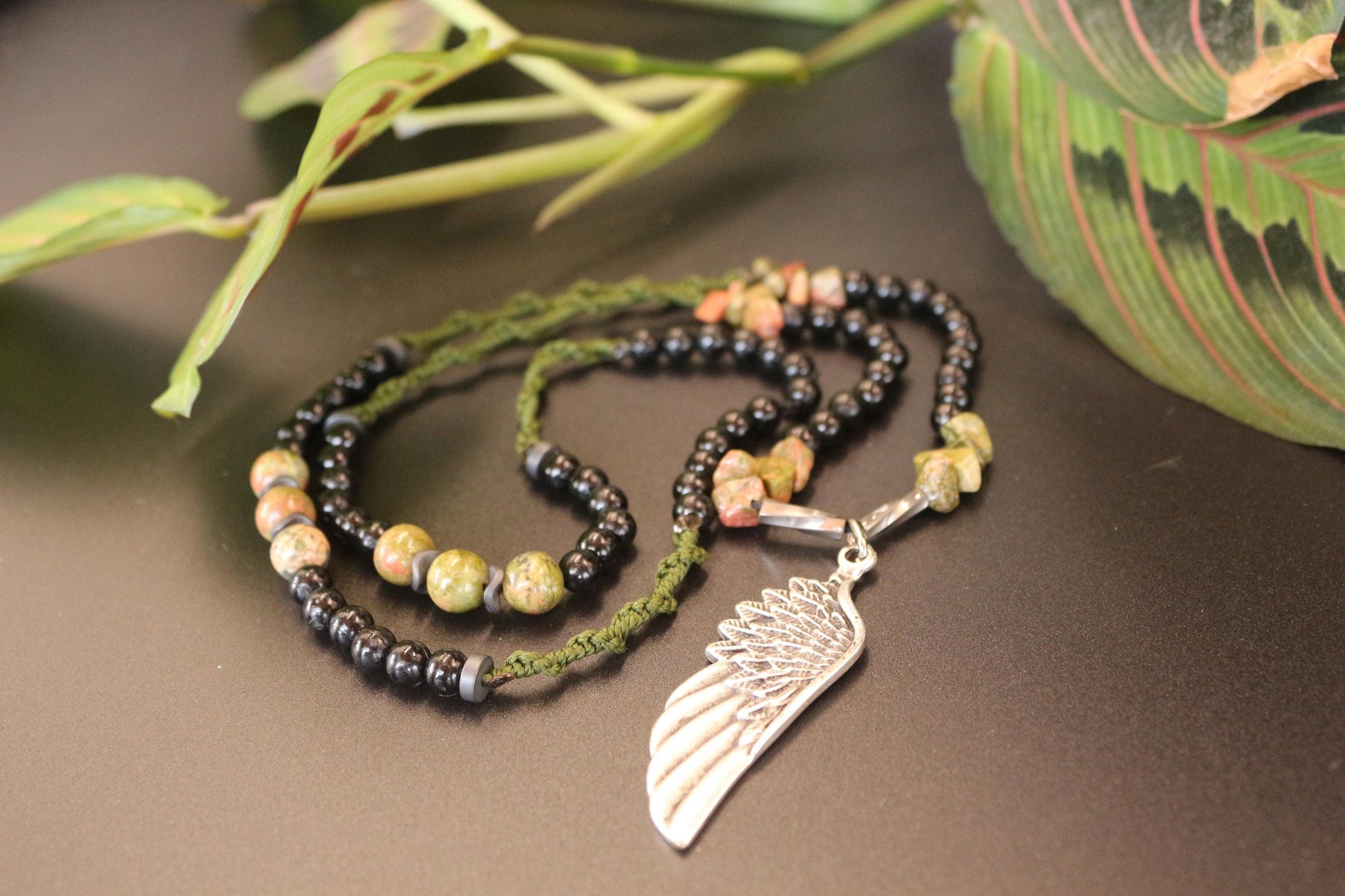 Это уникальное ожерелье ручной работы сочетает в себе природную красоту унакита и оригинальный плетёный шнур, создавая стильный и символичный аксессуар. Изящная подвеска в виде крыла завершает композицию.